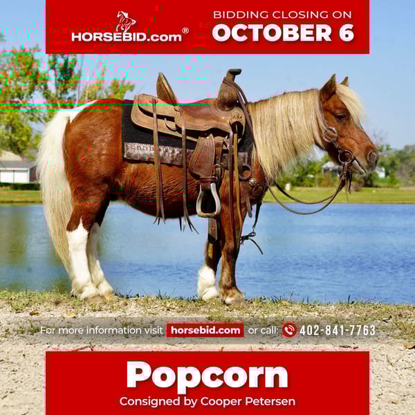 🍂 𝓐𝓾𝓽𝓾𝓶𝓷 𝑨𝑳𝑳 𝑺𝑻𝑨𝑹 𝑳𝑰𝑵𝑬𝑼𝑷 🍂 Happening now thru MONDAY | OCTOBER 6th - Available EXCLUSIVELY on HorseBid's website! For more details and to register visit: www.Horsebid.com CONSIGNOR CONTACT: Cooper Petersen 402-841-7763 LOCATION: Corsica SD BREED: Pony REGISTERED: No COLOR: Paint HEIGHT: 32 inches AGE: 14 GENDER: Gelding Popcorn is a super cute 32 inch 14 year old paint pony gelding. Popcorn has been used for lead line, pony rides at the fair, around the farm and down the ditches and trails, he has great manners on the ground, and rides independently fantastic for the kids, a super nice safe pony that any age or level can ride, he is good with other horses and ponies, good to load/haul/unload, easy keeper no special care. A great addition to any family. Call or text 402-841-7763 for more information.