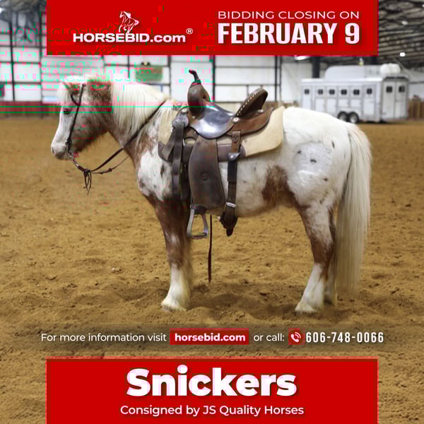 ❤️🔥𝑩𝒆 𝑴𝒊𝒏𝒆 𝐒𝐄𝐋𝐄𝐂𝐓❤️🔥 Happening now thru MONDAY | FEBRUARY 9th - Available EXCLUSIVELY on HorseBid's website! For more details and to register visit: www.Horsebid.com CONSIGNOR CONTACT: JS Quality Horses 606-748-0066 LOCATION: Wallingford, KY BREED: Appaloosa pony REGISTERED: No REGISTERED NAME: Snickers COLOR: Red leopard HEIGHT: 12.3 AGE: 15 GENDER: Gelding We are proud to introduce snickers , He’s fun sized, rides like dad’s big horse and got the color everyone wants , what more could you ask for ? Standing at 12.3 hands tall, and prime aged. Snickers has spent most of his life working on a ranch out west, there’s no steer to feral, or hill to step, let alone a creek to deep , snickers is ready to work and always ready to please. Snickers has a solid walk, jog, lope, he has a nice little neckrein , and a great whoa. Snickers can jog and lope circles like the big horses, he isn’t your average pony, snickers got more ride to him than most quarter horses. Pull his bridle off and watch him ride around. Snickers picks up his leads and strives to do whatever Job is asked of him. Aside from being a solid citizen when it comes to working, snickers is GENTLE, he will come right to you in the field and is always in your pocket. Snickers loves people , but especially kiddos. Snickers stays broke with time off, and will ride the same whether it’s 85° and sunny or -2° and the wind is blowing, and in my book that is something to brag about now a days. If your wanting a seasoned, solid, safe pony this is your guy! Snickers doesn’t require any maintance, he stands to be trimmed, saddled, bridled, he loads, leads , ties, is great in a mixed herd and will suit anyone’s program. If you have a kiddo wanting to get into riding, or a handy child wanting a solid mount to go ranch on, snickers should be your next family member then! Snickers has roped small steers and will drag whatever is asked of him, he is patterned on the barrels and poles and will go whatever speed is asked of him, although his favorite speed is slow and steady, he will go whatever speed is asked of him as well. Snickers is ready for all the love and cookies a kid can offer!