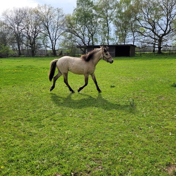 Cookie ist als Deutscher Falbe eingetragen. Auf den ersten Blick fällt er durch seine ungewöhnliche grau-gelbe Farbe und die schönen Augen auf. Sein Vater Champ de Lux ist Elitehengst, der Cookie auch die voraussichtliche Pony-Endmaßgröße sowie den Arbeitseifer mitgegeben hat. Cookie ist ausgesprochen freundlich und von klein auf an unkompliziert beim Führen, Verladen und der Hufpflege. Wir trennen uns als Altersgründen nur sehr schwer von unserem Kumpel und wünschen uns für ihn neue Besitzer, die Erfahrung mit Einreiten haben und ein zuverlässiges, angstfreies großes Pony suchen.
