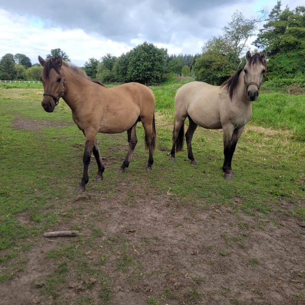 Cookie is registered as a German buckskin. At first glance, he stands out with his unusual grey-golden coat and beautiful eyes. His sire, Champ de Lux, is an elite stallion who has passed on Cookie’s expected pony-sized height as well as his willingness to work. Cookie is exceptionally friendly and has been easy to handle since a young age, whether leading, loading, or during hoof care. Due to age, we are very reluctant to part with our buddy and are looking for new owners who have experience in backing and are seeking a reliable, fearless, and well-behaved large pony.