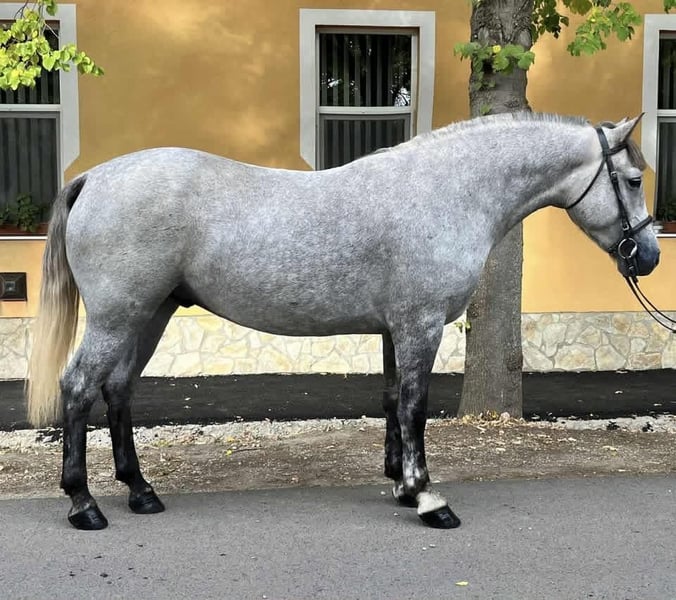 🩶💠 Silver 💠🩶 ~147cm ~5 Jahre Silver ist ein ganz besonderes Pony. Absolut Bombensicher in allen Situationen. Ein Absolutes Verlasspony, auch im Gelände. 💠 Charakter und Wesen Silver ist freundlich, aufmerksam und ruhig und passt sich außergewöhnlich gut an neue Umgebungen und Situationen an. Er kann sicher mit Kindern und unerfahrenen Reitern umgehen, ist aber auch für erfahrene Reiter ein spannender und verlässlicher Partner. Silver ist kooperativ, geduldig und bleibt stets ausgeglichen – sei es beim Reiten, im Stall oder beim Transport. 💠 Reiterlebnis Silver bietet in jeder Hinsicht ein zuverlässiges und komfortables Reiterlebnis. Sowohl auf dem Platz als auch im Gelände ist er stabil, reagiert sensibel auf Hilfen. Sein ruhiges, aber waches Wesen gibt dem Reiter jederzeit Sicherheit. Ich kann ihn mir sehr gut auch in einer Reitschule vorstellen, da ihm wechselden Reiter nichts ausmacht. 💠Lernfähig und gut erzogen Silver ist leicht zu trainieren und passt sich schnell an neue Aufgaben an. Wer mit Silver arbeitet, wird schnell erfahren, wie bereichernd die Zusammenarbeit mit einem intelligenten und aufmerksamen Pferd sein kann. Er hat keine schlechten Angewohnheiten, und dank seines ruhigen Wesens sind alltägliche Arbeiten, Reiten und Pflege stets problemlos und sicher. 💠 Gesundheit und Handhabung Silver ist vollkommen gesund, regelmäßig geimpft und entwurmt. Der Hufschmied kann problemlos mit ihm arbeiten, er gibt zuverlässig die Hufe und ist beim Verladen problemlos. Aufgrund seiner leichten Handhabung ist er in jeder Situation ein verlässlicher Partner – sei es beim Freizeitreiten oder bei längeren Ausritten. Für Videos gerne hier melden +4917640177894