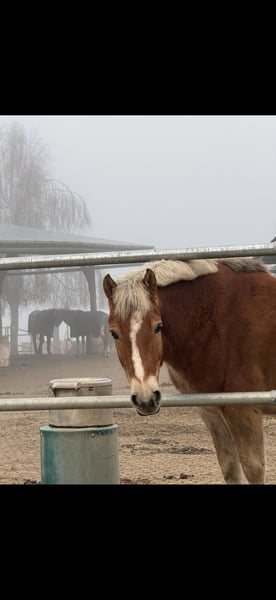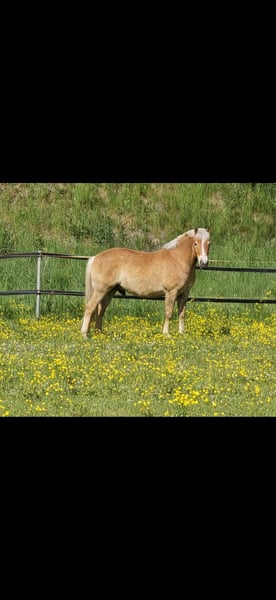 Ist am 20.6.2019 geboren, hat ein Stockmaß von ca. 1,36 m. Aktuell wird er als Beisteller abgegeben, da er sich im September eine Sehnenverletzung am Bein zugezogen hat. Seitdem steht er im Offenstall, um die Verletzung in Ruhe auszukurieren. Vor seiner Verletzung wurde er brav und zuverlässig im Gelände geritten und auch 1 und 2 spännig Kutsche gefahren. Außerdem geht er sehr gerne als Handpferd mit – dabei ist er stets anständig, ruhig und zuverlässig. Typisch Pony bringt er manchmal einen kleinen Dickkopf mit, weshalb er eine konsequente, liebevolle Hand braucht. Wer sich darauf einlässt, bekommt aber ein echtes Goldstück: Er ist sehr verschmust, neugierig, sucht stets Aufmerksamkeit und genießt den Kontakt zum Menschen sehr. Zu beachten ist, dass er Angst vor Spritzen hat – hier braucht man Geduld und Einfühlungsvermögen. Grundsätzlich sehr verträglich wenn er geärgert wird weiß er sich jedoch zu wehren. Ist kein Haflinger auch wenn er so aussieht. Vater ist ein Lewitzer Fuchsscheck und Mutter eine Braunes Pony Stute. Platz vor Preis
