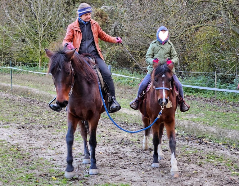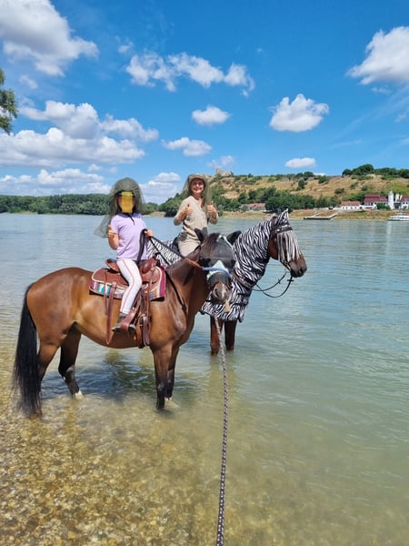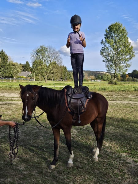 Ein liebes 7 jähriges Slowakisches Sportpony mit Abstammung, ca. 137 cm groß. Mit 3,5 Jahren hat er Reitergewicht kennen gelernt und dann erst vom 4ten Lebensjahr freizeitmäßig in allen 3 GGA geritten, auch das nicht täglich, damit sich sein Bewegungsapparat ohne zu viel Belastung gesund entwickeln kann. Dazwischen von Boden gearbeitet und gymnastiziert (Bodenarbeit, Doppellonge, Kavaletten, Freiarbeit). Sehr ausgeglichen, menschenbezogen, rangniedrigster und liebenswert. Auch für Sport geeignet. Steht in einer kleinen Privatherde 24/7 auf einer Wiese/Koppel mit Unterstand. Regelmäßig Hufe, Zähne, TE Behandlungen, geimpft.