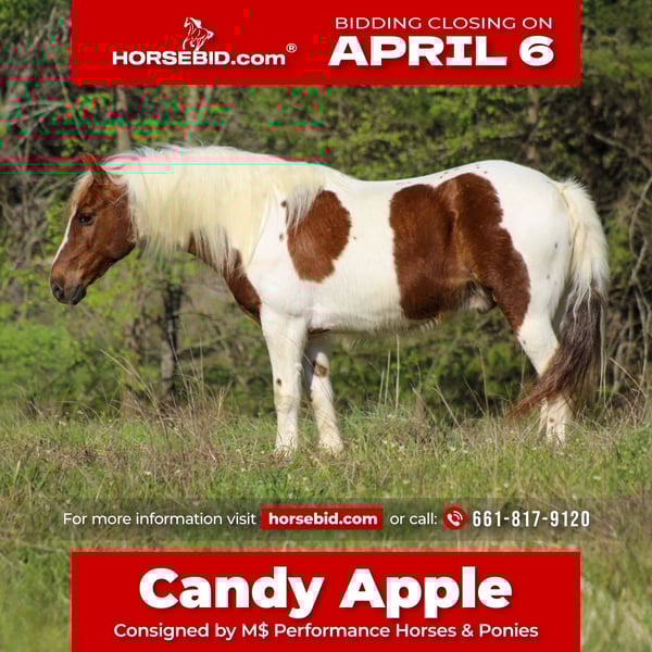 🌟𝑨𝒑𝒓𝒊𝒍 𝐀𝐋𝐋 𝐒𝐓𝐀𝐑 𝐋𝐈𝐍𝐄𝐔𝐏🌟 Happening now thru MONDAY | APRIL 6th - Available EXCLUSIVELY on HorseBid's website! For more details and to register visit: www.Horsebid.com CONSIGNOR CONTACT: M$ Performance Horses & Ponies 661-817-9120 LOCATION: Whitesboro,TX BREED: Pony REGISTERED: No COLOR: Paint HEIGHT: 12 AGE: 8 GENDER: Gelding Sweet as sugar and built like a little ranch boss — meet Candy Apple! If you’ve been dreaming of that one-in-a-million pony your kids will never outgrow, here he is. Candy Apple is an 8-year-old, 12.0 hand, feathered-foot gelding that’s as cute as a button and as broke as they come. This isn’t just a ride-around-the-yard pony… this is a been-there, done-that, wear-the-saddle-all-day kind of guy. He’s spent his time out on the ranch and in the sale barn penning cattle, sorting, and loading trucks week after week. He knows what a hard day’s work feels like—and he does it with a willing attitude every single time. And the best part? He takes all that real-world experience and makes it FUN and SAFE for his riders. In the arena, he’s a total show-off: He’ll walk, trot, and lope pretty circles, pick up his leads, slide into a nice stop, and neck rein around like a seasoned horse. He’s the kind that makes kids feel like rockstars and lets adults enjoy the ride too. Outside, he’s your point-and-go partner: Logs, water, tarps, hills—you name it, Candy Apple handles it without a second thought. Brave, steady, and honest every step of the way. On the ground, he’s just as lovable: He’ll meet you at the gate like he’s been waiting all day just for you. Easy to catch, stands tied, loads up without fuss, bathes like a gentleman, and fits right into a mixed herd. Let’s just say it like it is— Candy Apple is the kind of pony most people spend years trying to find. Just in time for summer, he’s ready to be the reason your kids don’t want to come inside. Whether it’s learning, playing, helping, or just making memories… this little gelding is the real deal. We are open to anyone interested in him to schedule a time to come see him or if you can’t make it schedule a FaceTime showing to see him. 661-817-9120 If you need help with transport don’t hesitate to ask we have a list of reputable haulers that can get him safely to your doorstep WORLD WIDE including, Alaska , Mexico, Hawaii, Canada and anywhere in between.