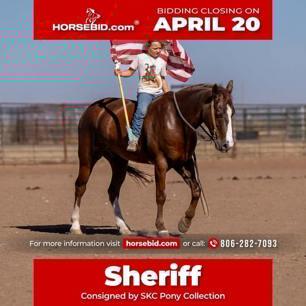 ⚜️𝐭𝐡𝐞 𝓔𝓵𝓲𝓽𝓮 𝐒𝐩𝐫𝐢𝐧𝐠 𝐂𝐥𝐚𝐬𝐬𝐢𝐜⚜️ Happening now thru MONDAY | APRIL 20th - Available EXCLUSIVELY on HorseBid's website! For more details and to register visit: www.Horsebid.com CONSIGNOR CONTACT: SKC Pony Collection 806-282-7093 LOCATION: Canyon, TX BREED: Pony REGISTERED: No REGISTERED NAME: Sheriff COLOR: Sorrel HEIGHT: 14.1 AGE: 8 GENDER: Gelding Sheriff is one of the coolest little horses we’ve had. This has been Saylor’s personal go to horse for the last year and a half. He’s the one she grabs when she goes to work with her dad, to ship and sort on, he’s great to drag calves on and he’s solid outside alone on a big gather. Sheriff has a huge heart and an enormous personality, he will literally meet you at the gate every single day ready for whatever you want to do. He’s been taught to curbside mount, so he will side pass to any mounting block fence, tree, or whatever’s handy for the kids to jump on and go for a joy ride bareback. Sheriff has flawless transitions up or down, I promise there isn’t on smoother. His trot and lope just float and are so smooth anyone would love them. Sheriff has a great stop, side pass and turns around one handed. He’s packed all ages of kiddos along to rope the sled, breakaway slow calves and steer stop the steers. He’s good to doctor cattle on outside as well. Sheriff has been hauled along to the JR rodeos to push calves, he’s also been the horse we have loaned our nieces to get their start going through the barrels flags, goats and poles. He always knows exactly what level of rider is in his back and adapts to them, it’s truly special to see. Sheriff has also packed our youngest Townes around at the Palo Duro Canyons and the Canadian River! Sheriff crosses all the water and rocky terrain with ease and is extremely careful with his footfall. He has spent many afternoons babysitting Townes while his older brother rides his dirt bikes all around him. Saylor has even cruised Sheriff around English and take him over some 18 inch jumps. The word “NO” just isn’t in Sheriffs Vocabulary! Sheriff fits every single child from 1 year to 21 years. He’s FUN and SAFE and one of the more PURE horses you will ever find. Please call us with any questions 806-282-7093 We can help arrange shipping anywhere. We would love to invite you out to meet this wonderful gelding and take him on a test ride! Vet checks welcome at buyers expense.