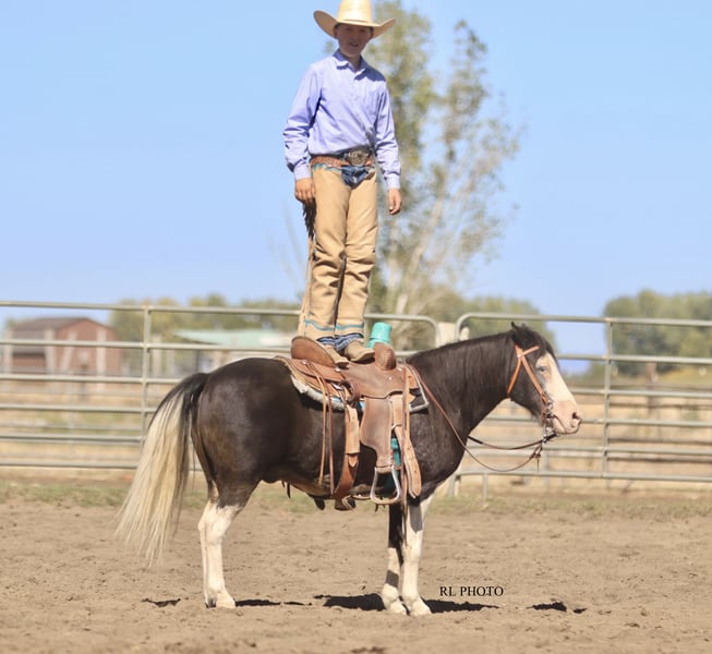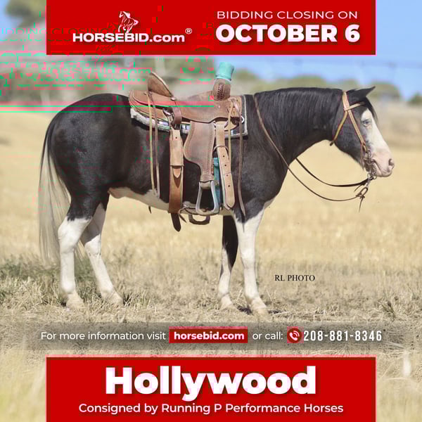 🍂 𝓐𝓾𝓽𝓾𝓶𝓷 𝑨𝑳𝑳 𝑺𝑻𝑨𝑹 𝑳𝑰𝑵𝑬𝑼𝑷 🍂 Happening now thru MONDAY | OCTOBER 6th - Available EXCLUSIVELY on HorseBid's website! For more details and to register visit: www.Horsebid.com CONSIGNOR CONTACT: Running P Performance Horses 208-881-8346 LOCATION: Hamer ID BREED: Pony REGISTERED: No COLOR: Black and White Paint HEIGHT: 12.1 AGE: 9 GENDER: Gelding Introducing HOLLYWOOD!!! Hollywood is a 2016 pony gelding standing 51 inches tall. A little horse with a BIG heart! Anything you have in mind Hollywood is ready to take on the challenge. Roping, trails, working on the ranch, play days, jumping, tricks, you name it he can do it all while being extremely safe and FANCY broke! You will have a hard time finding another like him, he spins on a dime, lopes around like a big horse, has great stops and is absolutely the classiest pony you’ll ever see. With two blue eyes, bald face, jet black coat, four white socks all the way up to his belly and a white tail, he is prettier than most big horses! Hollywood is fully trained to lay down on command. He has the most willing and trainable mind, the sweetest personality and always willing to do whatever is asked of him. We have had Hollywood in our family for several years, he has been passed from kid to kid teaching each one of them how to ride and giving them confidence! He is suitable from anywhere to a lead line pony to teaching your kid to rope! Hollywood is great to both heel and breakaway on, he is great in the box, super cowy and runs hard to the cow! He is also great to use on the ranch where he has kept young cowboys and cowgirls safe in rough country gathering and moving cattle. He is equally as great on the trails and is always happy to go whatever speed asked of him as well as being sure footed and happy to cross anything in his path. Saddle him up months fresh and he rides off like he was ridden yesterday. Hollywood has done so much for our family and it’s time he teaches the next generation of young cowboys and cowgirls. We are so sad to see him go but PROUD to offer one of the very best ponies we have ever seen. Please call us at 208-881-8346 with any further questions or to come see him for yourself!