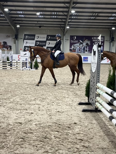 Chestnut Mare from Greater Poland with a Heart for Jumping. Perfect for riders beginning their competition journey. At home, she was ridden by three young riders aged 15, 15, and 17. She is well-behaved with the farrier and veterinarian. Under the care of a physiotherapist. She is gentle in handling, does not bite or kick (she is a sweet mare). Fast, agile, and precise in show jumping. Healthy and injury-free (TUV available for review from January 2024). Jumped at home up to 120 cm. Has competed multiple times in the LL class, often placing and also competed in the L class. Due to her sporting pedigree, she would also be suitable for breeding. It is very important to me that she finds a loving home. Sale due to the desire to pursue further development.
