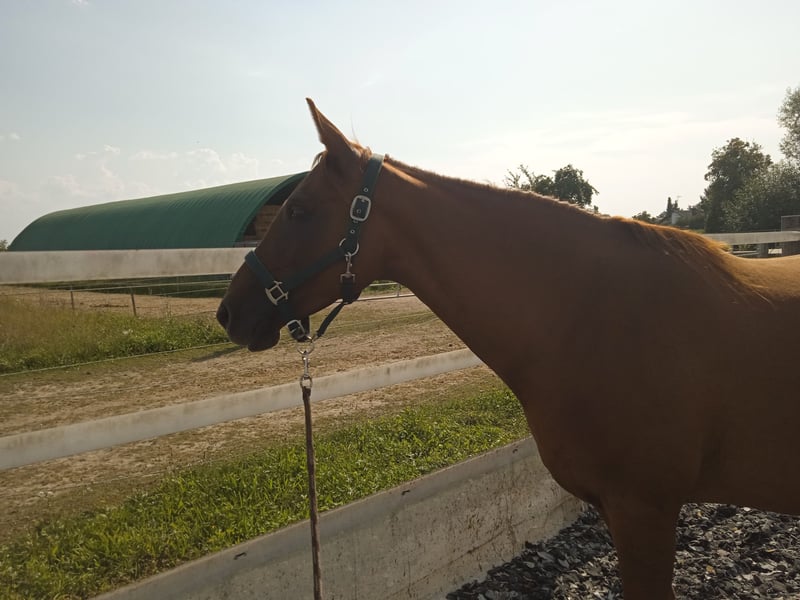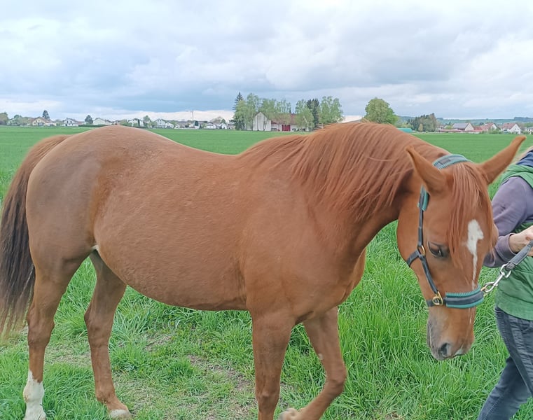 Liebevolle Stute abzugeben, Platz vor Preis Unsere 12-jährige Fuchsstute Emmi sucht ein neues Zuhause! Die Zimtschnecke ist sehr lieb und anhänglich und gern auch mal flotter unterwegs. Sie ist ca. 1,50 m groß und im Pass als Großpferd ohne Rassebezeichnung eingetragen; wahrscheinlich aber mit größerem Araber-Anteil. Bei den Vorbesitzern stand sie in einer Box und wurde englisch geritten. Wir haben sie im Februar 2025 gekauft, sie steht jetzt in einem Aktivstall, kennt also auch Herdenhaltung. Wir haben bisher viel vom Boden aus mit ihr gearbeitet, da wir noch nicht so sicher im Sattel sind. (Sie hat bei unseren Reitversuchen aber sehr fein auf Zügelhilfen reagiert und wollte unbedingt alles richtig machen). Wir waren auch viel spazieren mit ihr, das hat ihr sehr gut gefallen, sie läuft sehr zügig und sicher im Gelände, ist manchmal bei Unbekanntem etwas schreckhaft. Emmi läuft barhuf, ist gechipt & geimpft, Zähne wurden erst im Herbst gemacht, und die Physio hat 2 Checks durchgeführt. Aus familiären Gründen müssen wir uns leider schon wieder von ihr trennen. Da sie schon länger nicht mehr aktiv geritten wurde, bräuchte sie noch etwas Zeit für Muskelaufbau, sie ist aber mit Sicherheit ein ganz tolles Reitpferd und würde sich freuen, wenn der neue Besitzer viele Ausritte macht und sie gut gearbeitet wird. Zusätzlich kann auch ihr Zubehör gekauft werden, darunter ein ganz neues Signum-Paddle, Hufschuhe, Kappzaum etc. Der Preis ist verhandelbar, uns ist ein guter Besitzer wichtiger, da sie sich viel an einer Bezugsperson orientiert und nach einiger Zeit sehr anhänglich wird. (Sie wiehert im Stall immer, wenn sie uns sieht und kommt uns entgegen.) Schreib uns an, wenn du Emmi gern kennenlernen möchtest Videos gerne auf Anfrage