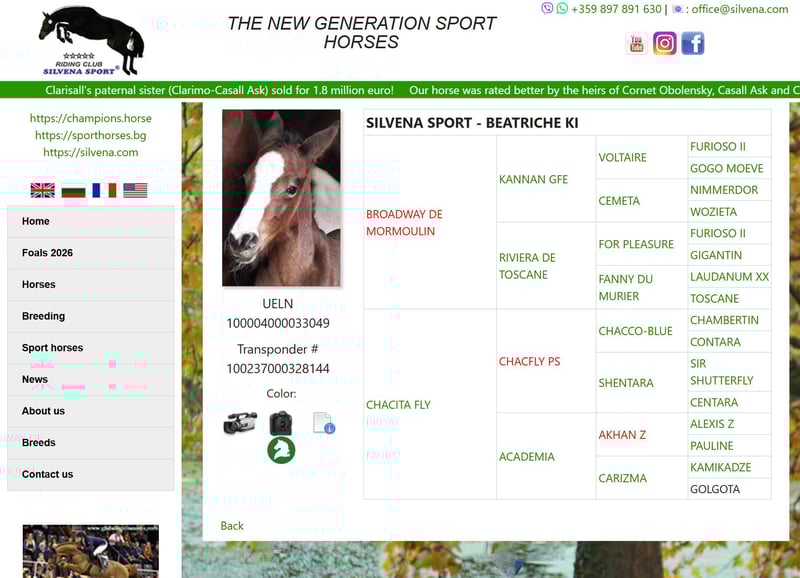 The sire is the champion of France in the high class under the saddle of Edward Levy: https://www.youtube.com/watch?v=a7cWkM6GaoA Beatriche KI's dam has brothers and sisters on the paternal line, who are sold at auctions in Europe for fabulous prices exceeding 200-250K euros: https://www.facebook.com/BulgarianSportHorses/posts/pfbid0gkmyNJ9FYk5rfEfNXK36hcP8cbJFWLjFVCKJerstiyjV4xAX7sSkf9G7hMtfj5zgl