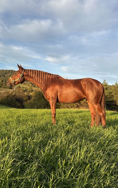 Young mare for sale. She has successfully completed this years competition season in dressage (level A) and show jumping (80 cm). She is very well-behaved and used to hacking both alone and in a group. Her height is abbout 154 cm. She is promising. Suitable for both beginners and experienced riders. She is especially known for her calm and stable character. We are her first owners.