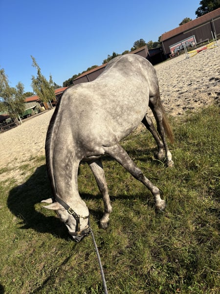 Aus persönlichen Gründen wird ein Verkauf in Erwägung gezogen, falls sich die passende Person findet. Die Stute ist sehr sensibel und nervös und benötigt daher eine ruhige, klare Bezugsperson und konstante Arbeit. Durch einen Riss im Unterstützungsband und meine darauf folgende Schwangerschaft stand sie auch nach der Auskurierung noch länger auf der Wiese und wurde erst vor einem Jahr schonend angeritten. Entsprechend ist sie ausbildungstechnisch nicht altersgemäß gefestigt und noch sehr unausbalanciert. Bei Unsicherheiten zeigt sie schnell Spannung und steigt bei völliger Überforderung, weshalb sie nicht für Anfänger:innen geeignet ist. Realistisches A-Niveaus Dressur / Springen in der Zukunft bei weiterer Ausbildung. Jedoch aufgrund ihres Charakters vermutlich nie ein Schleifengarant oder „Selbstläufer“. Unter dem Reiter benötigt sie eine sehr sichere, ausbalancierte und ruhige Reitweise. Im Stall webt sie leider. Sie benötigt daher viel Draußenzeit und ausreichend Heu, um das Stressverhalten zu reduzieren. Sie läuft aktuell Barhuf und zeigt sich dabei schmiedefromm und lässt sich gut verladen. Sie wurde bereits im Gelände geritten und macht dies artig, ist jedoch nicht verkehrssicher, da sie in der Stadt große Angst vor Autos zeigt. Gesucht wird ein erfahrener, reflektierter Mensch mit realistischen Erwartungen, der Freude an Aufbauarbeit hat und bereit ist, in Ausbildung, Training und Haltung zu investieren, ohne sportlichen Druck. Abgabe erfolgt nicht aus Zeitdruck, sondern ausschließlich in ein passendes, langfristiges Zuhause. In der Zwischenzeit wird sie kontinuierlich weiter ausgebildet. Am Liebsten mit Equipment abzugeben, da Spring- und Dressursattel erst auf sie angepasst wurden. Platz vor Preis.