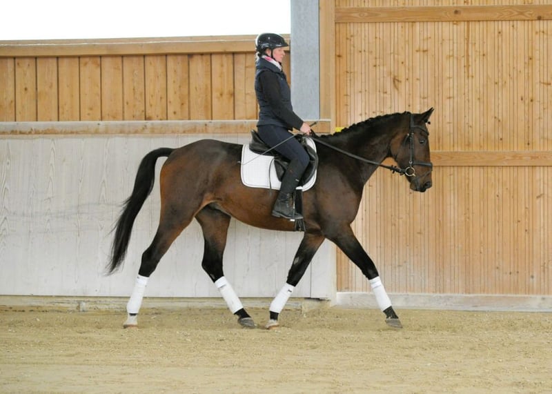 Stylish and lovable dark bay gelding with charm and elegance! Attentive son of Caraoki with three good gaits, charming and affectionate. His open and balanced nature immediately wins hearts with his sweet personality. Always curious and eager to learn, he is eager to be further trained and possesses good riding qualities. His strong type makes him suitable for all disciplines, whether dressage, jumping, or trail riding. Currently being trained at E-level, appropriate for his age.