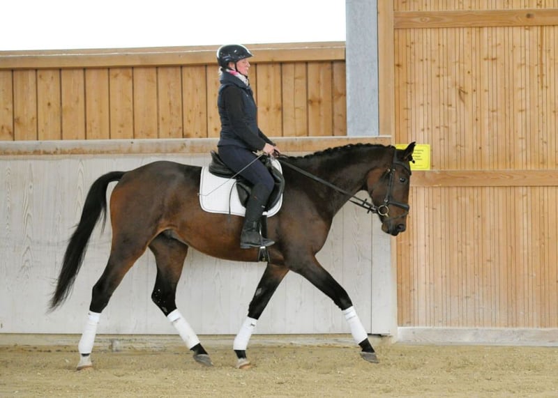 Schicker und liebenswerter dunkelbrauner Wallach mit Chic und Charme! Aufmerksamer Sohn von Caraoki mit drei guten GGA, dazu charmant und liebenswert. Durch sein aufgeschlossenes und ausgeglichenes Wesen schließt man ihn mit seiner süßen Art sofort ins Herz. Stets neugierig und wissbegierig möchte er weiter gefördert werden und ist mit guten Rittigkeitswerten ausgestattet. Sehr typgeprägt ist er für alle Sparten einsetzbar, ob Dressur, Springen oder Gelände. Seinem Alter entsprechend gefördert derzeit auf E-Niveau.