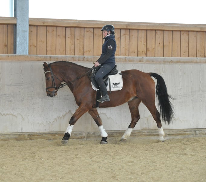 Dieser hübsche, 5-jährige Wallach vom bekannten Vererber Acorado, Vater Aromats, überzeugt mit drei guten GGA und sehr viel Talent am Sprung sowie toller Einstellung. Äußerst bequem zu sitzen vermittelt er ein wunderbares Reitgefühl. Er kennt das Training auf den Äußenplätzen sowie in der Halle. Dressurmäßig auf E und A-Niveau ausgebildet eignet er sich auch für unerfahrene Reiter, durch seine Größe auch für Damen und Junioren.