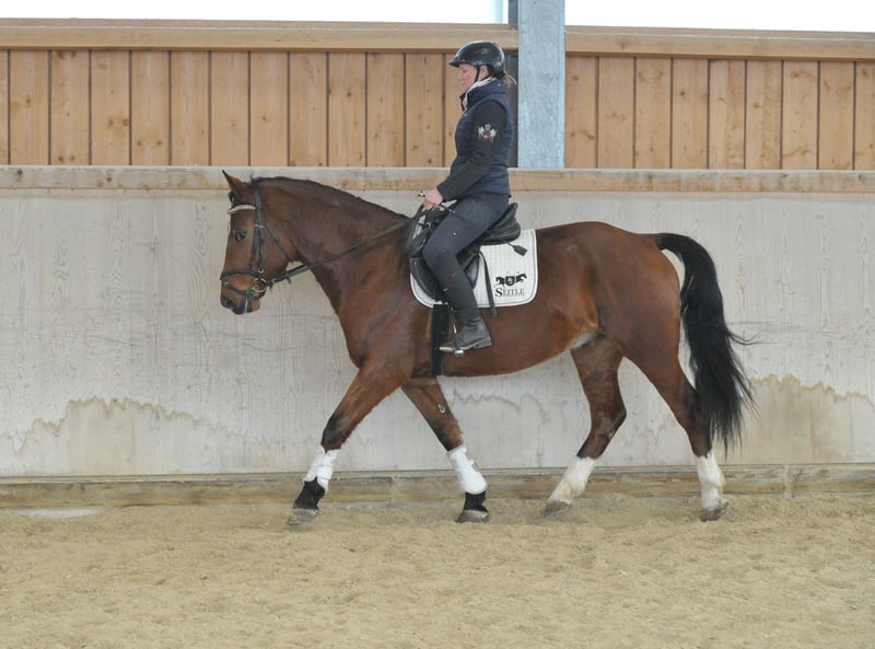This handsome 5-year-old gelding by the well-known sire Acorado, father of Aromats, impresses with three good gaits, exceptional talent over fences, and a fantastic temperament. He is very comfortable to sit and provides a wonderful riding experience. He is familiar with training both outdoors and in the indoor arena. Dressage-wise, he is trained up to E and A levels, making him suitable for less experienced riders. His size also makes him ideal for ladies and juniors.