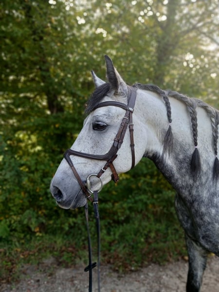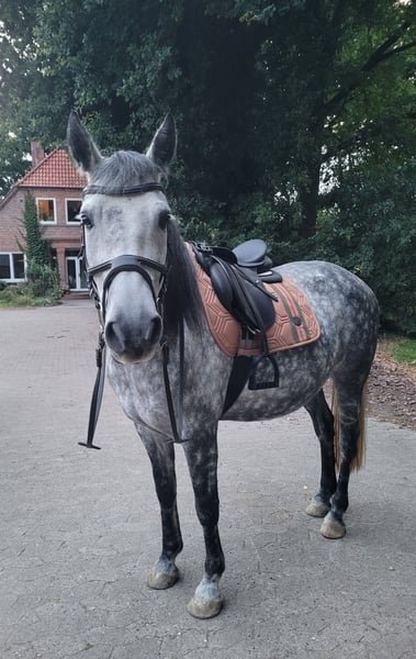 Hallo, Zum Verkauf steht mein lieber Wallach Aragon, geboren 2017, ca. 157 cm groß. Er ist ein ausdrucksstarker Apfelschimmel, der durch seinen tollen Charakter und seine ehrliche Art überzeugt. Trotz seiner Größe deckt er 'auch größere Reiter gut ab'. Aragon ist ein lernwilliges und aufgewecktes Pferd, der seinen eigenen Menschen sucht – jemanden, der mit Ruhe, Geduld und Vertrauen mit ihm arbeitet. Er ist seit etwa einem Jahr solide unter dem Sattel und zeigt sich dabei sehr kooperativ. Sowohl in der Bahn als auch im Gelände ist er brav und unkompliziert unterwegs. Freispringe7n findet er super und macht das mit Freude mit – auch unter dem Reiter hat er bereits erste Sprungerfahrungen gesammelt und zeigt dabei eine gute Übersicht und Motivation. Er wäre am liebsten immer bei allem dabei und ist einfach nur Liebenswert. Ein artgerechtes Zuhause ist mir sehr wichtig – ideal wäre Offenstallhaltung oder ein vergleichbares Haltungsmodell mit viel Sozialkontakt. Keine reine Boxenhaltung. Aragon ist regelmäßig beim Zahnarzt und beim Hufschmied. Anhänger fahren ist noch nicht seine Leidenschaft aber wir arbeiten stehts dran. Geht nicht an Händler!!