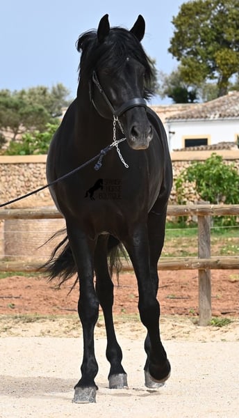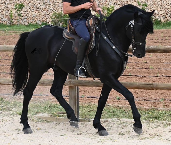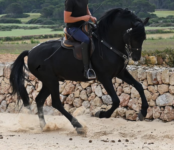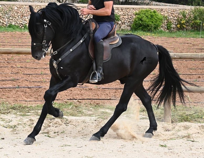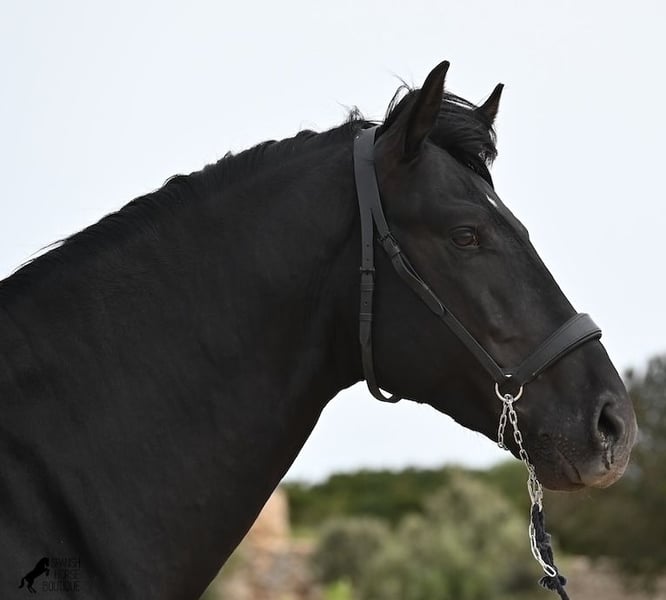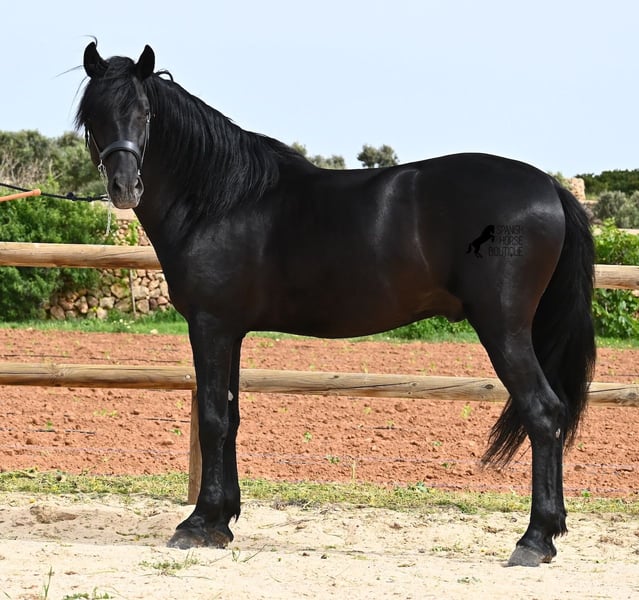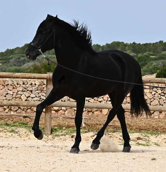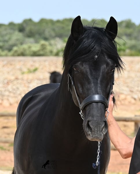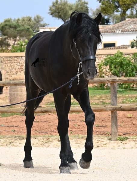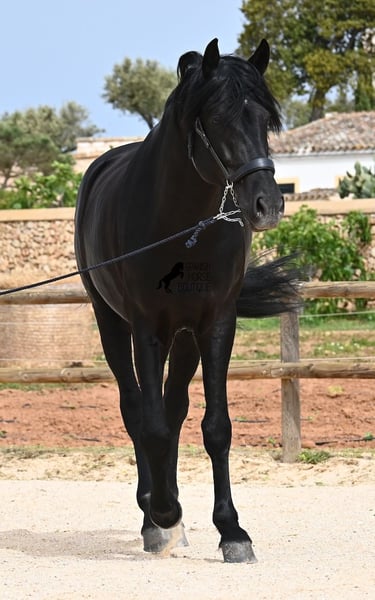 This 2020-born purebred Menorquin stallion is a true sight to behold in many respects. His beauty is immediately apparent! However, what makes him even more of a visual delight is his spirit and the enthusiasm he shows for work! He has been classically started under English riding and is now being ridden one-handed in the local Doma Menorquina. He has also gained experience in fiestas, proving that nothing can faze him. He is primarily ridden out in the field, often accompanied by a mare! He is accustomed to the presence of mares and geldings, greeting them with a neigh as he passes by, but otherwise ignores his fellow horses. His good upbringing is evident both on the ground and under saddle, as he is absolutely well-mannered yet full of life, just as one would expect from a young horse. He is very focused while working, and it is clear that he truly enjoys pleasing and learning new things. An ideal partner for anyone looking for a safe, solidly trained, and beautifully striking horse! He carries old lines of the Menorquin but has not yet been presented for approval, as the owner is not a breeder. Of course, the approval could be organized. And if he needs to be a gelding, then the castration can certainly be arranged as well. Currently standing at 164 cm, he is of a good size, with a few more centimeters expected to come, as Menorquins are not fully grown until the age of 8. Aside from a very small star that he cleverly hides under his forelock, he is completely black. He is currently located in Menorca! Videos and pedigree available upon request. I would be happy to organize a vet check, castration, training, transport, or your travel arrangements should you wish to come and see him in person. More details can be found on my page or in conversation. Greetings from Spain!