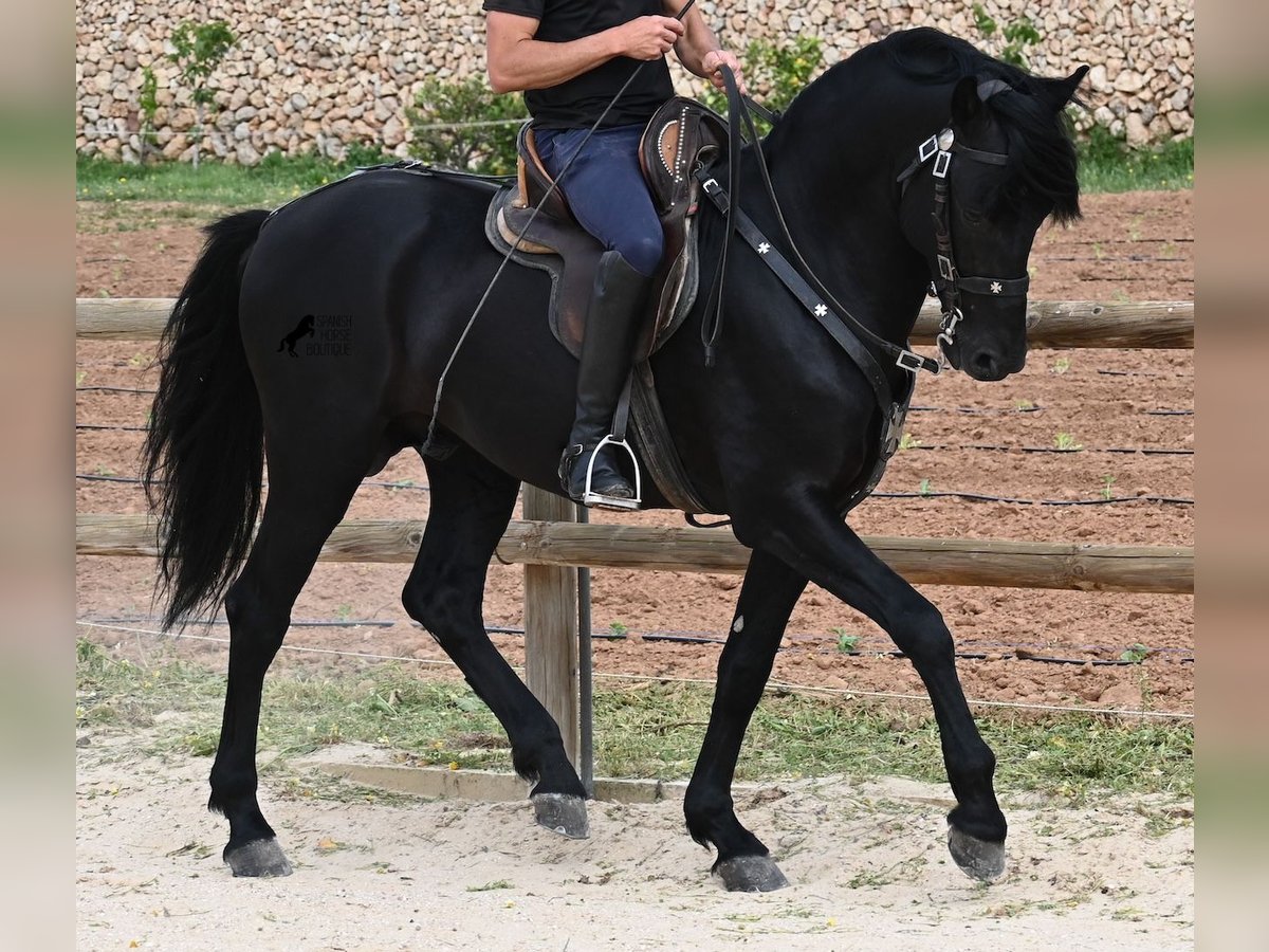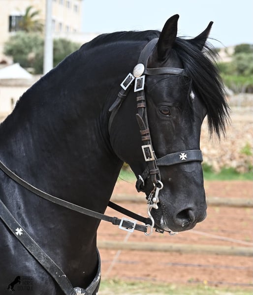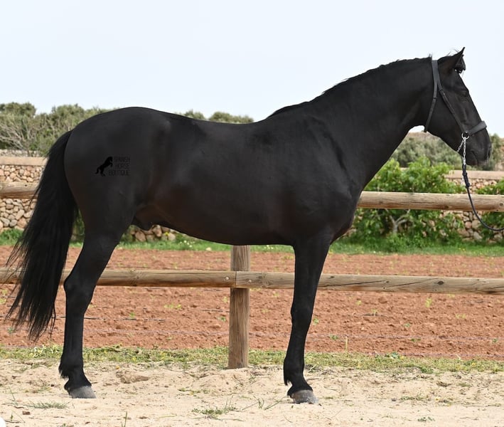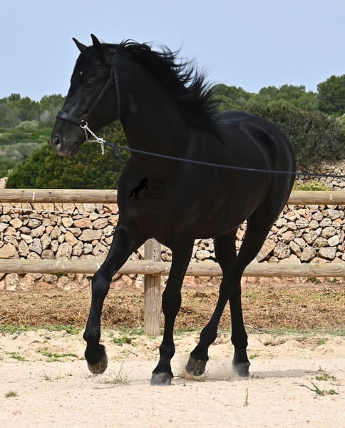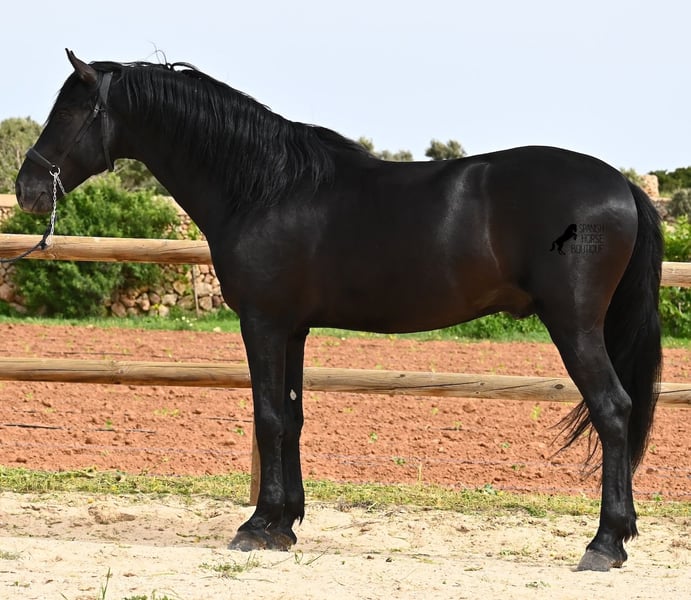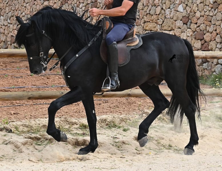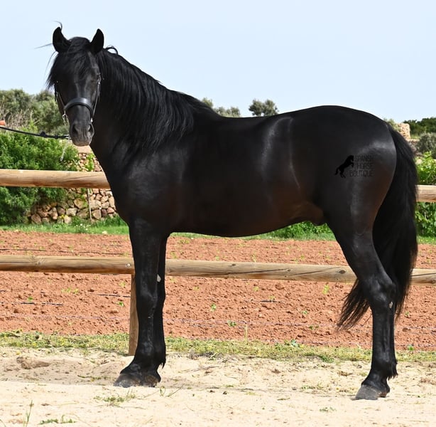 This 2020-born purebred Menorquin stallion is a true sight to behold in many respects. His beauty is immediately apparent! However, what makes him even more of a visual delight is his spirit and the enthusiasm he shows for work! He has been classically started under English riding and is now being ridden one-handed in the local Doma Menorquina. He has also gained experience in fiestas, proving that nothing can faze him. He is primarily ridden out in the field, often accompanied by a mare! He is accustomed to the presence of mares and geldings, greeting them with a neigh as he passes by, but otherwise ignores his fellow horses. His good upbringing is evident both on the ground and under saddle, as he is absolutely well-mannered yet full of life, just as one would expect from a young horse. He is very focused while working, and it is clear that he truly enjoys pleasing and learning new things. An ideal partner for anyone looking for a safe, solidly trained, and beautifully striking horse! He carries old lines of the Menorquin but has not yet been presented for approval, as the owner is not a breeder. Of course, the approval could be organized. And if he needs to be a gelding, then the castration can certainly be arranged as well. Currently standing at 164 cm, he is of a good size, with a few more centimeters expected to come, as Menorquins are not fully grown until the age of 8. Aside from a very small star that he cleverly hides under his forelock, he is completely black. He is currently located in Menorca! Videos and pedigree available upon request. I would be happy to organize a vet check, castration, training, transport, or your travel arrangements should you wish to come and see him in person. More details can be found on my page or in conversation. Greetings from Spain!