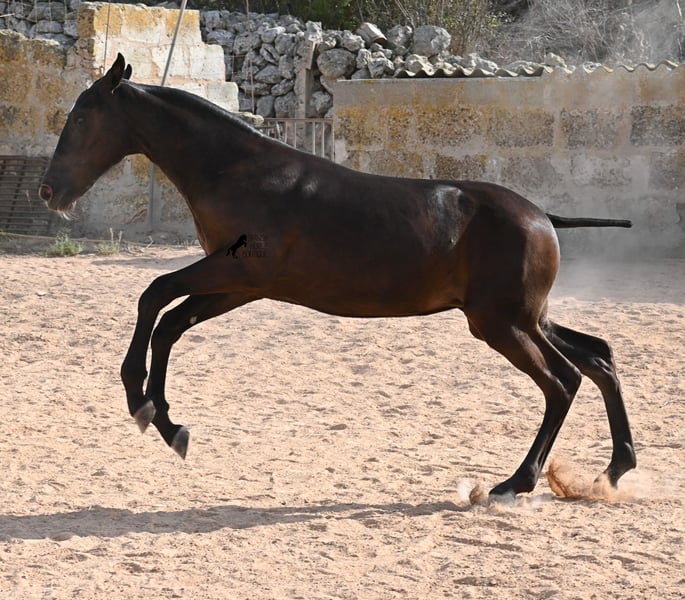 Esta yegua menorquina pura raza, nacida en primavera de 2025, ya es muy elegante y femenina. Su delicada cabeza con una mirada suave se adapta bien a su exterior grácil, y sus ojos brillan como su estrella en la frente. Ya ha sido destetada con éxito y es manejable con cabezada, después de haber estado en grandes praderas, en un grupo con yeguas de todas las edades. Hay muchas subidas y bajadas en terrenos rocosos y muy duros, donde siempre están afuera, sin importar el clima. Esto no solo la ha hecho muy social y robusta, sino que también ha contribuido a su crecimiento saludable, lo cual se puede ver en sus patas claras y buenos cascos. Ahora vive en un "jardín de caballos", donde puede jugar y prosperar, como se desea en la crianza, para convertirse en un caballo sano y social. Por parte paterna, tiene varios campeones de raza como hermanos, y por parte materna proviene de las originales "líneas de fiesta" del menorquín. Es muy ágil, tiene un fuerte trasero y una espalda igualmente fuerte. Más adelante será interesante para muchas disciplinas, seguramente también para la Equitación de Trabajo gracias a su agilidad. Es muy abierta hacia las personas y busca el contacto. Se espera que su altura final sea de alrededor de 160 cm. Videos y pedigree disponibles a solicitud. Su ubicación es Menorca. Con gusto organizaré una revisión veterinaria de potros, transporte o su viaje, en caso de que desee venir a verla personalmente. Para más detalles, no dude en visitar mi página o en conversar. Saludos desde España.