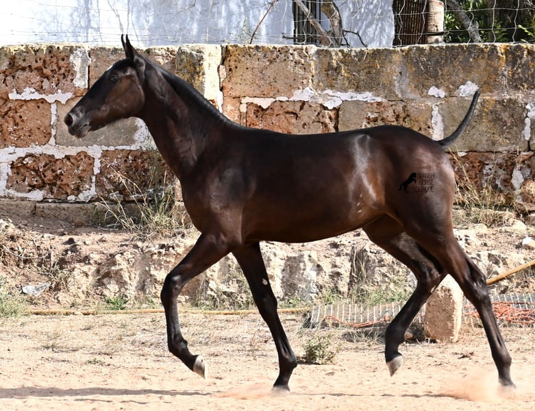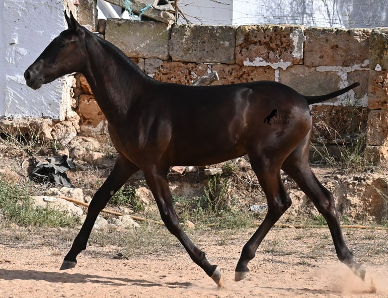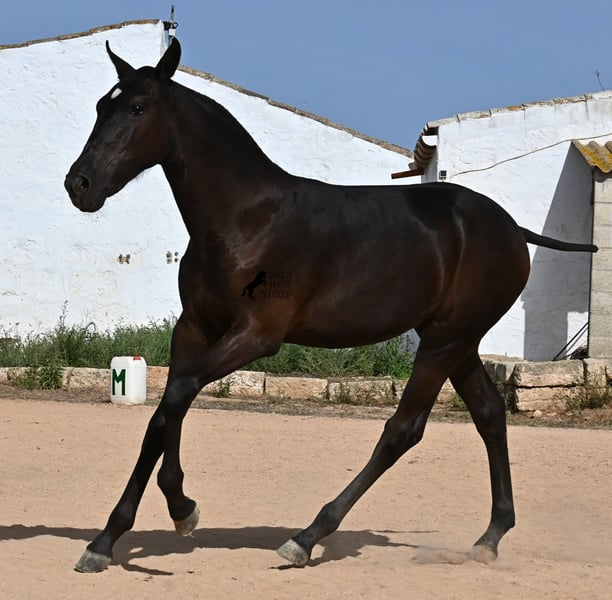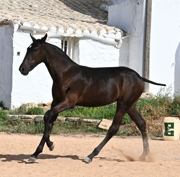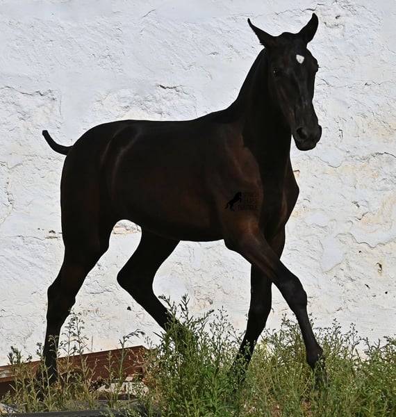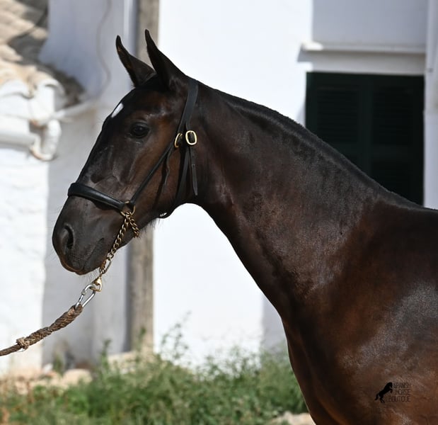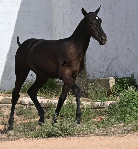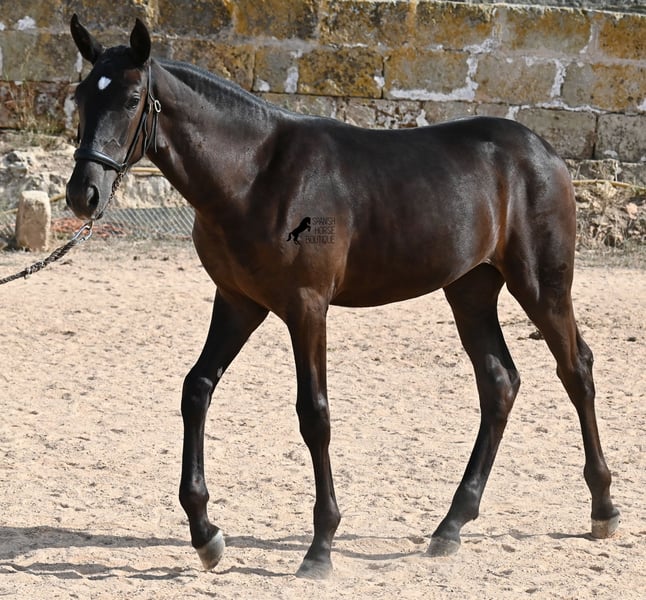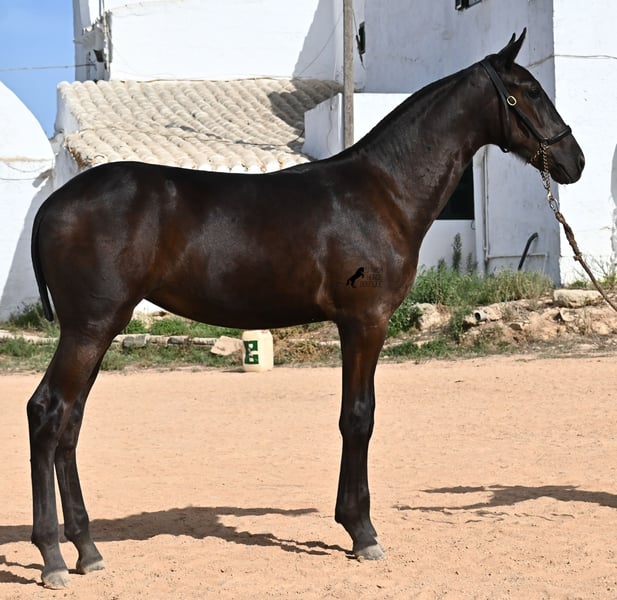 This purebred Menorquin mare, born in spring 2025, already exudes elegance and femininity. Her delicate head with a gentle expression suits her graceful conformation perfectly, and her eyes shine as brightly as the star on her forehead. She has been successfully weaned and halter-trained after spending time on extensive pasture land within a herd of mares of all ages. The terrain is hilly and rocky, with very hard ground, where she has been outdoors in all weather conditions. This has not only made her highly social and resilient but also contributed to healthy growth, as evidenced by her clean legs and good hooves. She now lives in a foal kindergarten, where she is free to play and thrive, as one would wish during upbringing, to develop into a healthy and social horse. On her paternal side, she has several Rassechampions among her siblings, and maternally, she descends from the original "Fiesta lines" of the Menorquin. She is very agile, with a strong hindquarters and a robust back. Later, she will be suitable for many disciplines, especially for Working Equitation, thanks to her agility. She is very approachable and seeks contact with humans. Her expected final height will be around 160 cm. Videos and pedigree available upon request. Her current location is Menorca. I am happy to arrange on-site foal health checks, transport, or her journey if you wish to visit personally. Further details can be discussed on my website or in conversation. Greetings from Spain