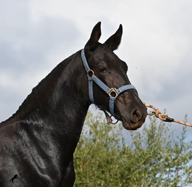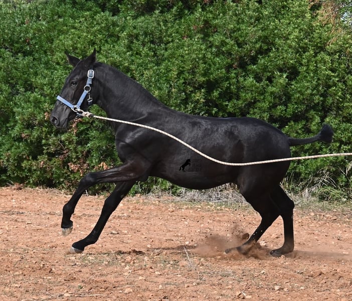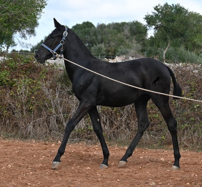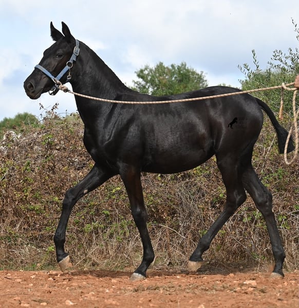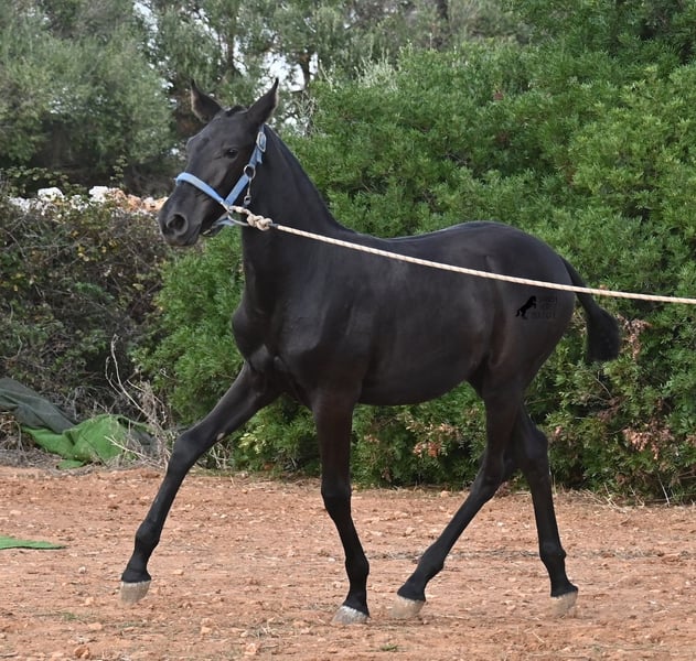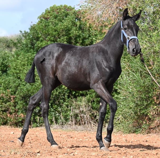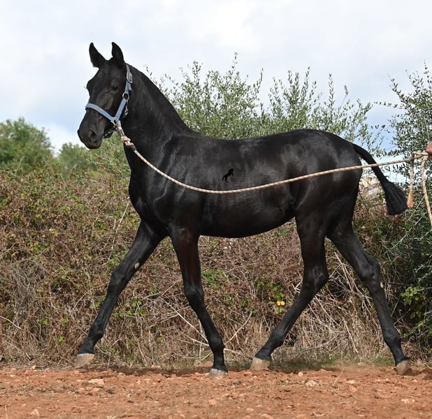 This purebred filly, born in spring 2025, is a truly elegant young lady! She comes from very old lines of the Menorquín, known for producing hardy horses, and she is beautifully jet black. With a blend of strength and grace, she demonstrates excellent movement, and proudly carries her tail high (traditionally docked like her mane). She moves gracefully even over rocky terrain, much like a ballet dancer. As is highly desirable in the breed, she has no white markings, and her dam is now even listed in the breed's improvement catalog. She is already quite tall, with her mother measuring over 16.1 hh. She was born in robust condition, is currently being weaned and is very calm and confident. She is familiar with dogs, children, and basic foal handling, and with her sweet temperament, she will learn quickly as she grows. Her expected final height is around 16.1 hh (or more!). Videos and pedigree available upon request. Her location is Menorca. I am happy to arrange a foal health check, transportation, or even her journey if you wish to visit her in person. Details can be discussed on my website or in a personal conversation. Greetings from Spain