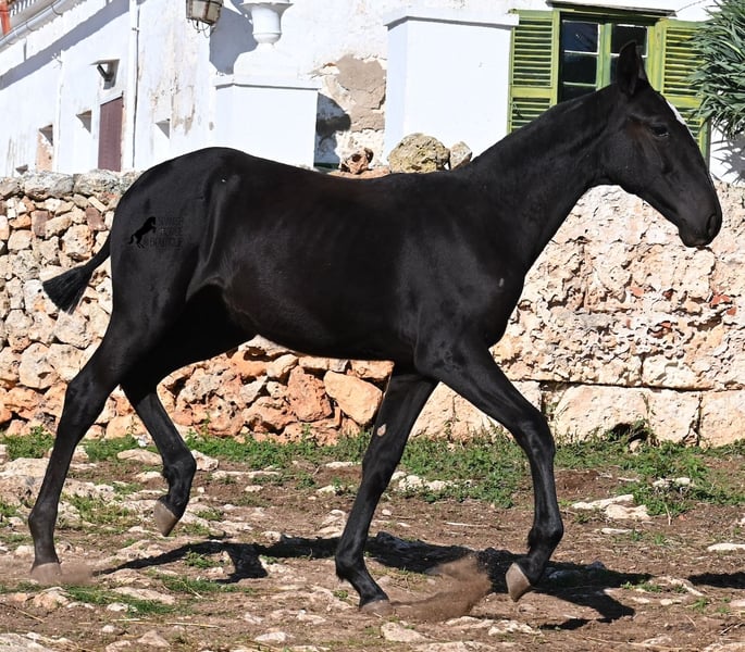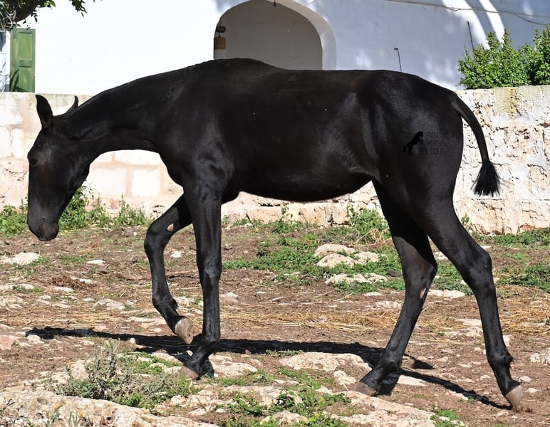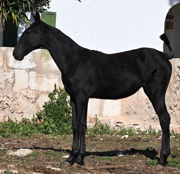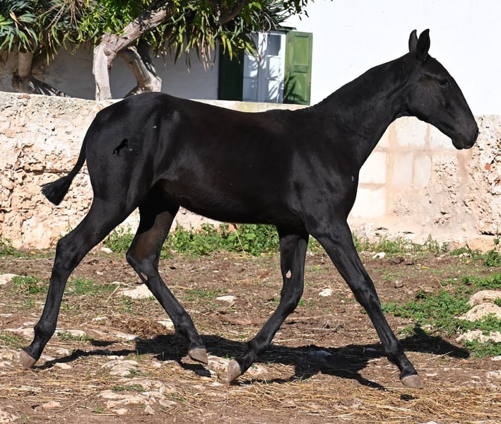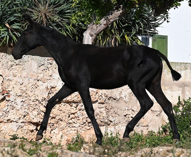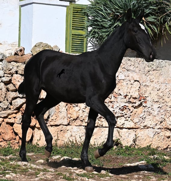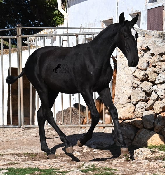 This purebred Menorquin mare, born in Spring 2025, undoubtedly stands out from the crowd thanks to her distinctive appearance! Her head markings are unique, and she boasts an ideal conformation for the breed. As is customary for a Menorquin, she is raised on rocky terrain and under a rugged climate. She is not only very sure-footed but already demonstrates her beautiful gaits on challenging ground. It’s easy to imagine how she will impress everyone with her movement in the dressage arena later on! Her pedigree is also impressive, as she is a daughter of one of only three elite stallions of the breed (her sire is over 16.1 hh). On her dam’s side, she descends from traditional Menorquin lines, and her head profile will make breed enthusiasts’ hearts beat faster. Her expected final height will be around 16.1 hh, making her suitable for many disciplines. It’s also wonderful to see how she already stretches out and how strong her topline is, which will benefit her as a riding horse in the future. She lives on many hectares of land in a herd, alongside older mares, and is well socialized. Videos and pedigree details are available upon request. Her location is Menorca. I am happy to arrange a foal health check, transport, or even her journey if you wish to visit her in person. Please see my website or contact me for more details. Greetings from Spain
