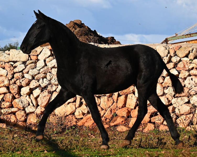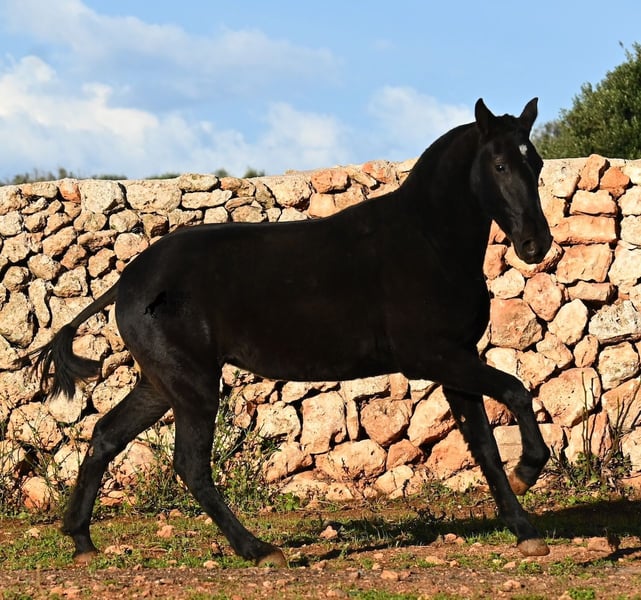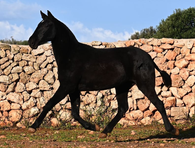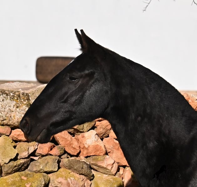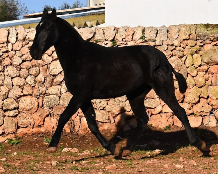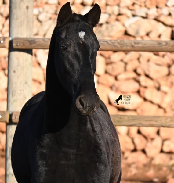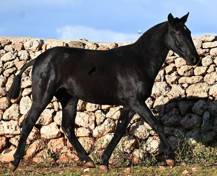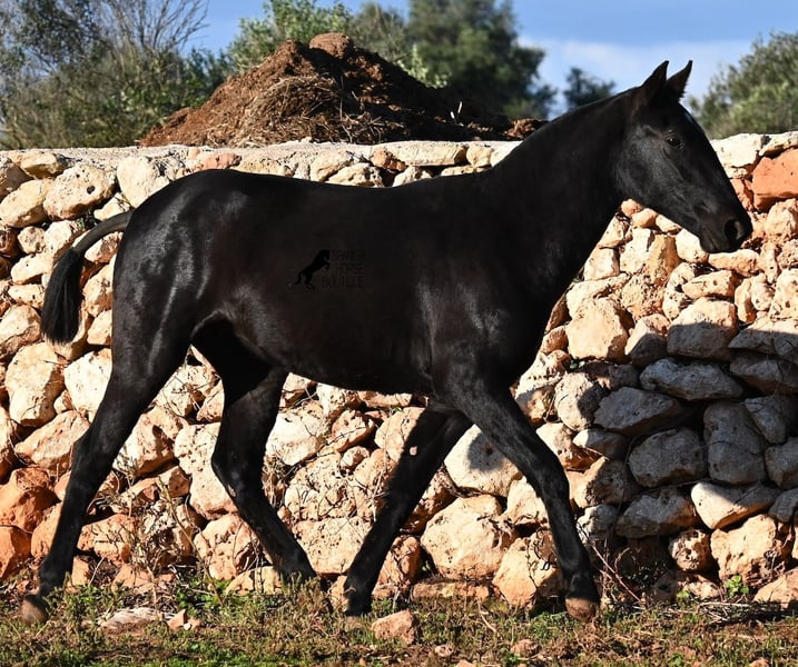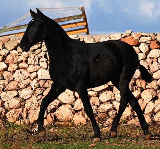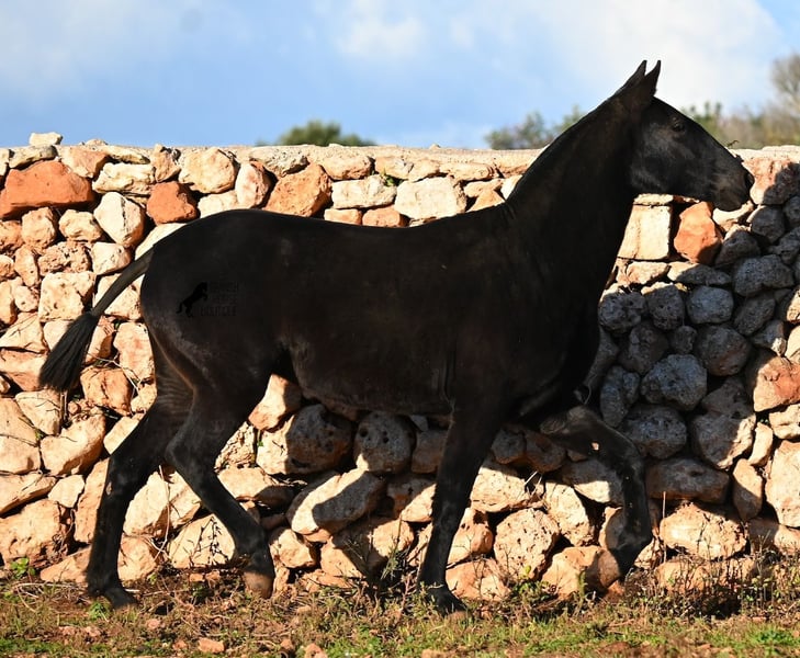 This purebred Menorquin mare, born in spring 2024, is a truly exclusive lady! She comes from a high-quality breeding program, and her dam has been awarded multiple prizes at breeding shows. Her sire is a breed champion and thus a world champion 😎. Her foal training includes thorough handling such as grooming, leading, hoof care, and loading. She is even familiar with lunging in a halter, as she was presented at a breeding show. This means she is comfortable being in new environments and around unfamiliar horses. She is able to enjoy her foal life on large pastures, grazing freely, and is kept together with mares of various ages, ensuring she is well socialized and well-mannered. Thanks to the rugged climate of Menorca, with occasional frosts, she will have no trouble adapting to different climates. Her expected final height is around 16.1 hh, and her compact conformation makes her suitable for many disciplines in riding later on. Apart from a small star, she is completely black, and her head is subtly subconvex, as is typical for her breed. Videos and pedigree are available upon request. Her current location is Menorca. I am happy to organize a foal health check (AKU), transportation, or her journey if you wish to visit her in person. Details can be found on my website or discussed directly. Greetings from Spain