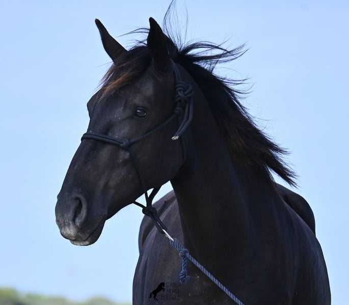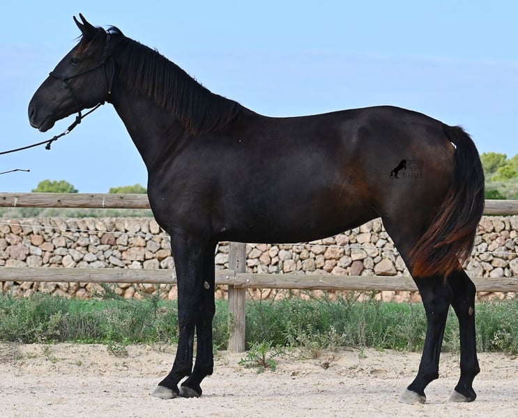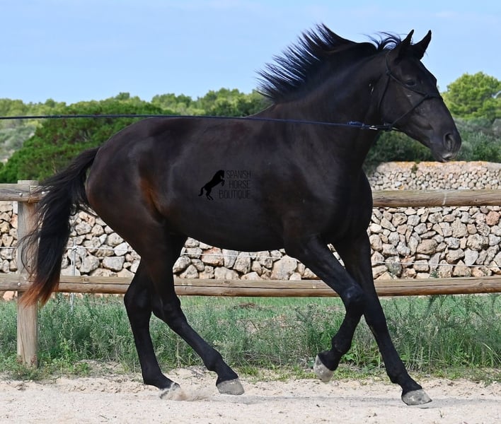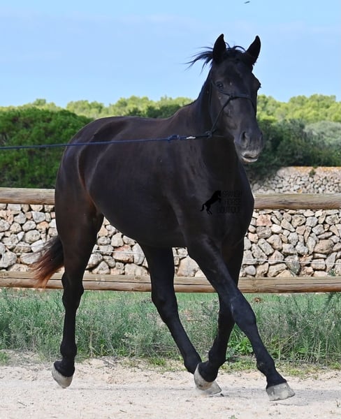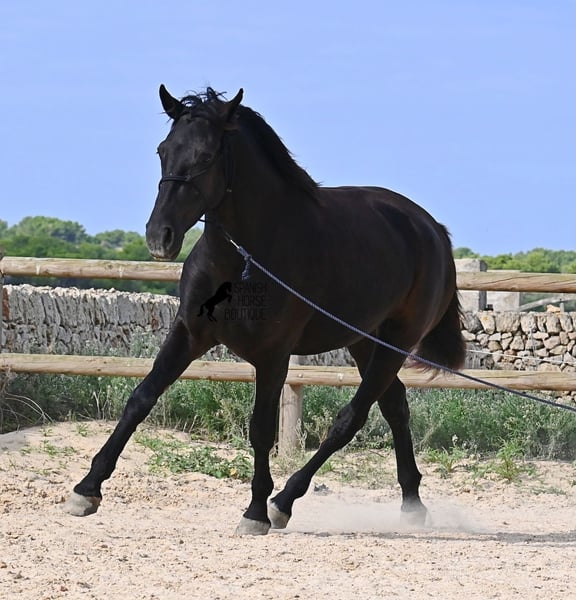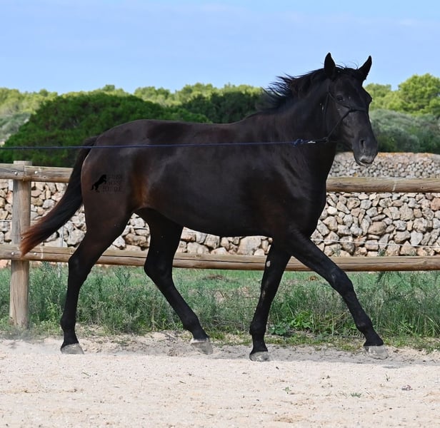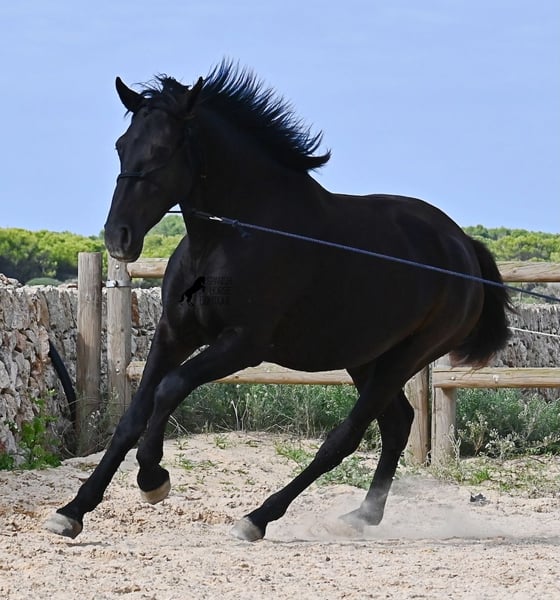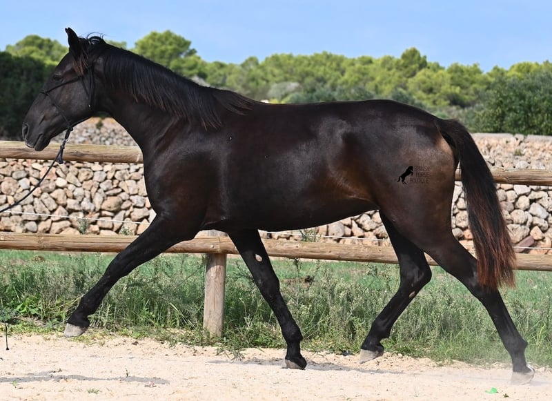 This loyal, gentle, and affectionate purebred Menorquin mare, born in 2023, already tells you a lot about her! She is a very sweet, calm, well-behaved, and refined young mare who wants to do everything right and is always attentive during work and handling. She lives in a herd and, thanks to the rugged climate and rocky terrain, she has strong hooves and clear legs. Speaking of legs, a close inspection reveals a barely visible white marking on one hind leg. Otherwise, she is completely black, as is desired in her breeding goal. She is already very well-behaved on the lunge line with a halter, although she is naturally still somewhat raw due to her age. Blood from very old lines of the Menorquin runs through her veins, known for endurance, bravery, and willingness to work, and she possesses all these qualities! She is compact and agile, which will make her interesting for many disciplines later on. Currently, she measures around 159 cm, and her final height will be just over 160 cm. Videos and pedigree available upon request. Her location is Menorca. I am happy to organize a foal health check, transport, or her journey if you wish to visit her in person. Details can be found on my website or in a personal conversation. Greetings from Spain