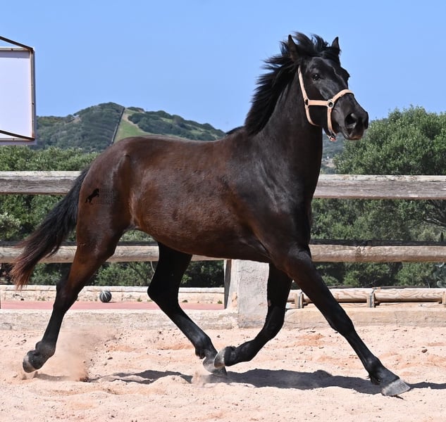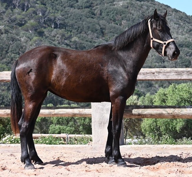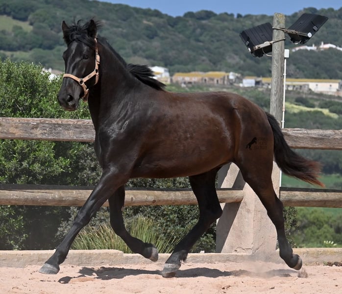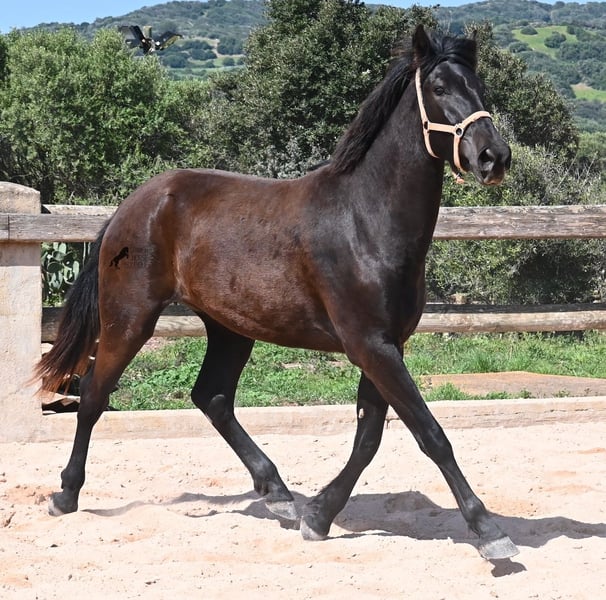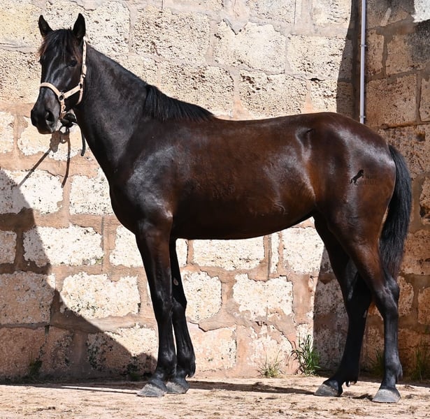 This 2023-born, purebred Menorquin mare definitely aims high! At just 2 years old, she already measures an impressive 164 cm and will certainly be approaching the 170 cm mark by the time she is fully grown. Proud and full of life, she sweeps across the arena, showcasing her charming spirit. She moves really well, and with her character and movement, she will not only be interesting for leisure riding but also for dressage and working equitation in the future. Her father is an outstanding stallion, as 3 (!) of his offspring have been breed champions! So this mare has very noble siblings and is definitely of interest to breeders, as she is also a descendant of BUYO on her mother’s side, one of the founding fathers of the breed. She lives in a herd in 24-hour robust housing, making her well-socialized and resilient, thanks to the harsh climate of Menorca. Since such large mares are very rare among Menorquins, her price range reflects the rarity of such a specimen. She is currently located in Menorca! Videos and pedigree available upon request. I can gladly arrange a vet check, training, transport, or even your trip if you wish to come and see her in person. More details can be found on my page or in conversation. Greetings from Spain!