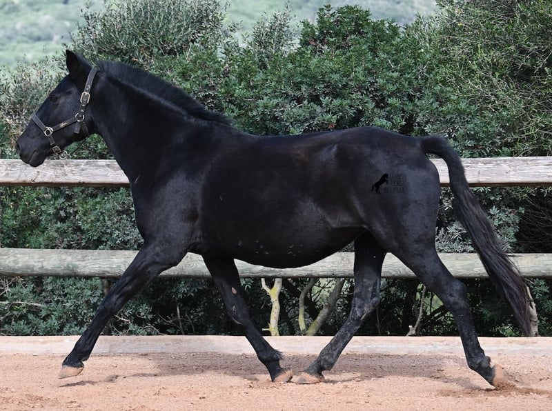 This 2016-born purebred Menorquín mare carries a purebred Menorquín foal in her belly. :) She is a breeding mare and has not been ridden. She was covered in March 2025, so travel for her and the foal is not an issue, and there is ample time for her to acclimate to her new environment before the foaling date. Apart from a white marking on one hind leg, she is completely black. You can see in her movement that she is carrying some extra weight, but otherwise she moves very correctly. She is kept in a 24/7 paddock system on many hectares of land, making her very resilient. Her qualities as a mother have already been proven, and she comes from very primitive lines of the Menorquín, known for endurance and versatility. Videos and pedigree available upon request. Her height at the withers is 156 cm, and she is barefoot. Location: Menorca. I am happy to arrange a pre-purchase veterinary examination, transportation, or her journey if you wish to view her in person. Details can be discussed on my website or in a conversation. Greetings from Spain