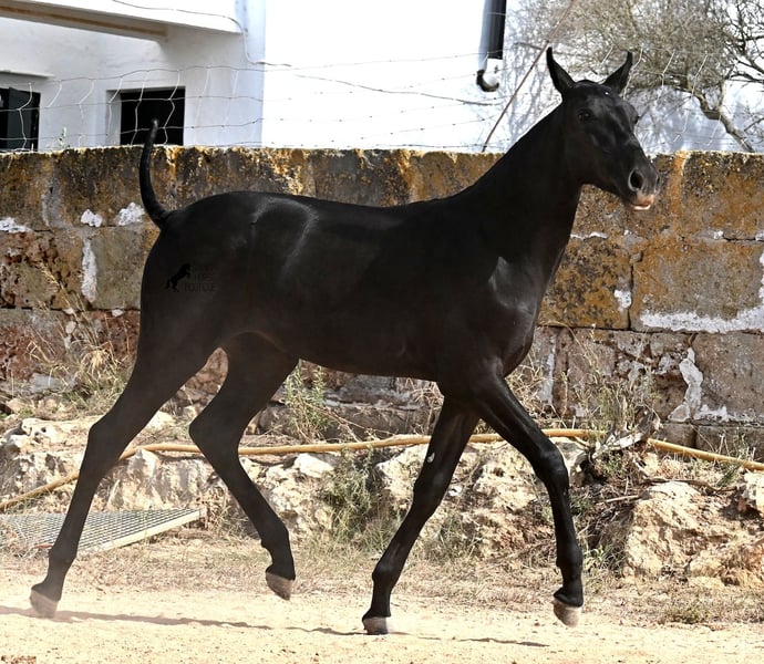 This purebred Menorquin filly, born in early 2025, has an impressive pedigree, as her father was the best stallion of the breed (best sire) and her grandfather is one of only 3 elite stallions of the breed. She has been successfully weaned and is halter-trained, having spent time in very large pastures with a herd of mares of all ages. The terrain is quite hilly, rocky, and very hard, where they are always outside in all weather conditions. This has not only made her very social and robust but has also contributed to her healthy growth, which is evident in her clean legs and good hooves. She now lives in a horse kindergarten, where she is allowed to play and thrive as desired during her upbringing to become a healthy and social horse. She has very correct movements and is very open towards humans. Her character is very calm and cool for a little one at such a tender age. Aside from a small white mark on her forehead, she is completely black, and her gaits are very correct, which will make her a versatile mare later on. Her expected final height will be around 162 cm. Videos and pedigree available upon request. Her location is Menorca. I would be happy to organize a foal vet check, transport, or even your trip if you wish to come and see her in person. Details can be found on my page or discussed in conversation. Greetings from Spain.