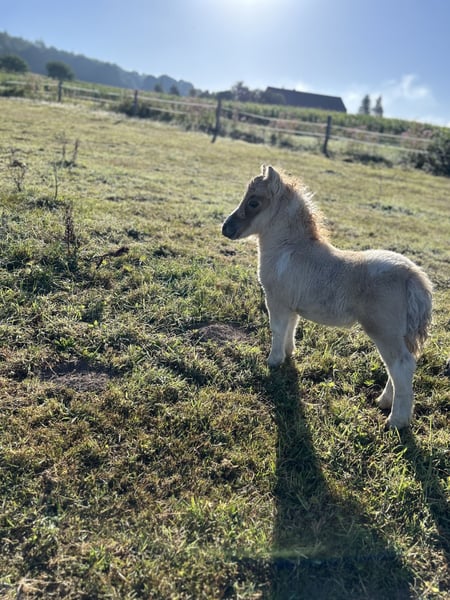 Mini Shetlandpony hengst, afgeleide veulen, schimmel, fjord