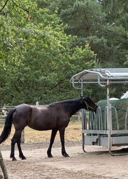 Leonards Lillifee Go – a stunning Missouri Fox Trotter mare, born in 2009, with an approximate height of 14.8 hh, in the beautiful black color. She is compact, correctly conformed, and healthy. She bears an old, fully healed scar on her right hock, which is a minor cosmetic blemish and does not affect her in any way. Lillifee loads easily, is familiar with the vet and farrier, regularly vaccinated and dewormed, and currently lives in a herd environment in an open stall. She is very dominant within her herd. She has an exceptionally gentle, people-oriented character, is open-minded, affectionate, gentle in handling, and very cuddly. Despite her good manners, she is not suitable for absolute beginners, as she has only been ridden irregularly so far due to time constraints. She is on a good learning path, eager to please, and can be further solidified with consistent, calm training. She is confident around children, dogs, and in traffic. She knows groundwork and is used for leisure riding. In the terrain, Lillifee is motivated and reliable, especially when accompanied, and moves out briskly. Under saddle, she is less enthusiastic but displays beautiful, rhythmical movements in all four gaits, typical for her breed and very comfortable to sit. Thanks to her excellent pedigree, Lillifee is also interesting for breeding, although she has not yet had a foal. With a heavy heart, she is being offered due to lack of time to a caring and nurturing new owner. She is a loyal partner for someone seeking a gentle, people-oriented mare with character, presence, and potential. Priority goes to a good home over price.