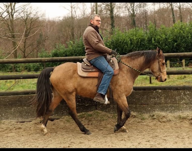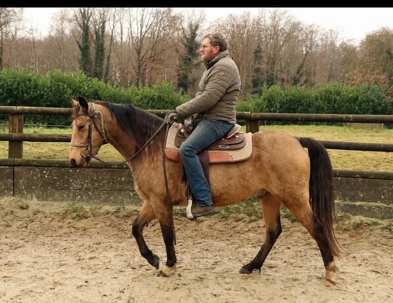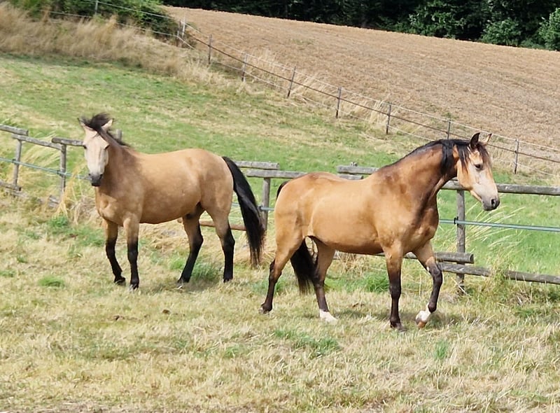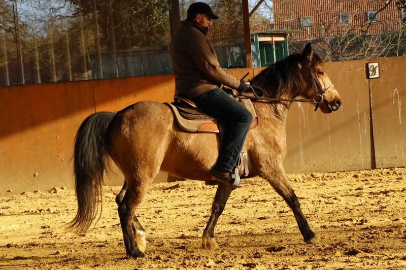 White Clouds Cisco Buckskin mit Bronze Schimmer, ein Traum für alle Disziplinen. Bisher viel im Schritt, Walk, Trab und Gallop im Gelände geritten. Ich habe jetzt auch angefangen mit ihm alleine rauszugehen und das macht er ganz entspannt und souverän. Dieser coole Wallach ist jetzt bereit für neue Abenteuer ! Er braucht jemanden der ihn Altersgerecht fördert, weiter ausbildet und Abwechslung bietet. Er ist : trittsicher geländegängig ausdauernd mutig selbständig robust stabil kurz im Rücken arbeitswillig Menschenbezogen neugierig Gesund lernt schnell Sehr feinfühlg in Bodenarbeit Grundausbildung beim Horsemen Trainer Michael Rieser November/Dezember 2024 beim Gangpferde Trainer Vierhaus (@ Fotos von Ellen Vierhaus) Zur weiteren Ausbildung und Ausbau des Flatfoot Walk CISCO ist ganzjährig Weidehaltung mit Offenstall gewöhnt, kennt Box vom Trainer und er soll weiterhin in artgerechte Offenstall Haltung mit genügend Auslauf. natürlich entwurmt und geimpft und Zähne gemacht