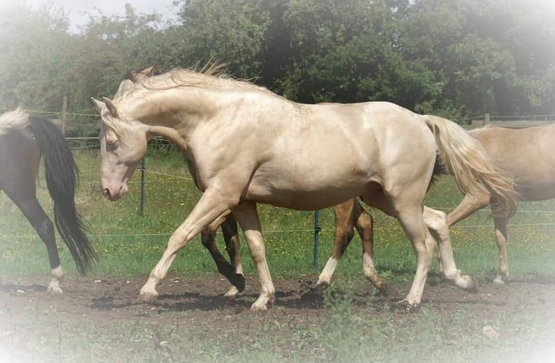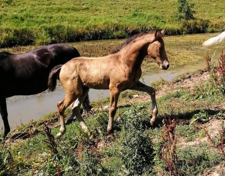 White Clouds Cisco Né le 12.06.2020 Missouri Foxtrotter avec papiers Buckskin avec un éclat bronze, Sunny Boy de l'optique et de la conformation parfaites, un rêve pour toutes les disciplines, un véritable costaud, sûr de ses pas, apte au terrain, aime être mené, mais se déplace dans toutes les positions, endurant, courageux, indépendant, robuste, stable, court de dos, volontaire, mais un peu paresseux sur le manège, orienté vers les humains, beau galop, se tient en premier à la clôture, curieux, joueur, drôle, audacieux, diligent, en bonne santé, apprend vite, professionnel en travail au sol, réactif et rapide. Formation de base avec l'entraîneur Horsemen Michael Rieser. Novembre/Décembre 2024 avec l'entraîneur de chevaux de gang Vierhaus (@ photos d'Ellen Vierhaus) Pour poursuivre la formation et le développement du Flatfoot Walk. Très équilibré dans un terrain difficile. Je l'ai acheté comme poulain, car il promettait de devenir comme son père un rassembleur naturel et a hérité de son excellent tempérament sûr de lui. C'est pourquoi j'ai acheté son demi-frère, qui sera beaucoup plus grand. CISCO a maintenant besoin d'un cavalier expérimenté, quelqu'un qui peut parfois s'imposer calmement et avec détermination, car il est encore au début de sa formation et n'a pas encore beaucoup travaillé, totalement non utilisé. Habitué à être en pâturage toute l'année avec un abri ouvert, groupe mixte, de rang élevé. Il a déjà participé à sa première petite randonnée et l'a maîtrisée avec brio, seul les dindons lui ont fait peur, mais il a ensuite suivi sans problème les grands Tennessee Walkers. Très bons sabots solides, jusqu'à présent en mode naturel. En bonne santé et plein d'énergie, naturellement vermifugé et vacciné.
