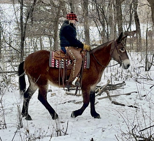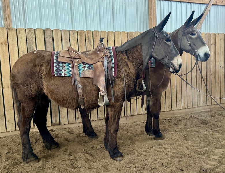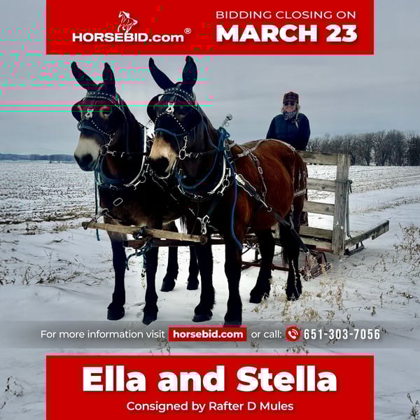 ⚜️𝓽𝓱𝓮 𝐆𝐎𝐋𝐃 𝓢𝓮𝓵𝓮𝓬𝓽⚜️ Happening now thru MONDAY | MARCH 23rd - Available EXCLUSIVELY on HorseBid's website! For more details and to register visit: www.Horsebid.com CONSIGNOR CONTACT: Rafter D Mules 651-303-7056 LOCATION: Hastings, MN BREED: Mule REGISTERED: No COLOR: Bay HEIGHT: 16 AGE: 11 GENDER: Molly Mule This is a very honest broke pair of mules they drive the very best and are gentle. They can be hooked either side of the pole. We have used them to feed with on the sleigh also have hooked to the wagons. They are easy to hitch and stand right where you stop them every time. As far as riding they are gentle riding mules that will go out together or alone. They will cross bridges and downfall and are happy just walking down the trail. If you need you can throw your pack saddles on them and take off. They lead very well in a string. Check these girls out and watch there video!