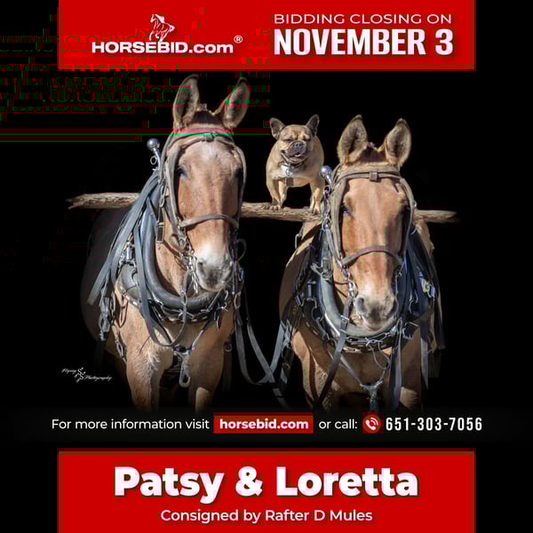 ⚜️𝐓𝐇𝐄 𝐅𝐀𝐋𝐋 𝐇𝐄𝐑𝐈𝐓𝐀𝐆𝐄 𝐂𝐋𝐀𝐒𝐒𝐈𝐂⚜️ Happening now thru MONDAY | NOVEMBER 3rd - Available EXCLUSIVELY on HorseBid's website! For more details and to register visit: www.Horsebid.com CONSIGNOR CONTACT: Rafter D Mules 651-303-7056 LOCATION: Hastings, MN BREED: Mule REGISTERED: No COLOR: Dun HEIGHT: 15 and 15.2 AGE: 12 GENDER: Molly Mule A team of mules may seem like a nostalgic thing of the past; a window shining open over a wild west that your grandpa told you stories about. This is the team of your dreams, but it's a dream you never have to wake up from; a reality that can be your own. Patsy and Loretta are the stars in our barn, proudly named after the famous ladies who were dubbed the queens of country music. They are a breathtaking view, with their gorgeous color and heavy dun factor. Patsy and Loretta are not the type of mules that you come across often, as they have it all: color, class, safety, and are a pure joy to be around! This fancy team is exactly what every beginner needs. They are easy to hitch, stepping over the tongue and waiting patiently until cued. Patsy and Loretta are exceptionally broke, and above all...SAFE! They have been around wildlife on the trails and roads, around other livestock, and our small pets. They are traffic safe, used to vehicles, other wagons, and even farm machinery. Just as any lady should be, these two are well mannered on the ground and under harness. We know that there are indeed 7 Wonders of the World, but, in our opinion, these mollies could be considered the 8th and 9th. Patsy and Loretta are not a team that anyone will be capable of matching anytime soon, so do not miss out on your chance to have your share of the bragging rights these gals offer. This gorgeous team was trained by voice command and are suitable for a complete beginner to drive. They are gentle, making them so easy and enjoyable to be around. Whether you would like a team to take for the church hayride, a team to ride out alone with amongst the quiet of nature, or a team that will babysit you at the annual chuckwagon races and western socials, Patsy and Loretta are your gals! They get along great when turned out with pasture mates and are also happy to be turned out together. They are also easy to catch! These fancy ladies are at the perfect age of maturity, with a long life ahead of them to provide someone with years of enjoyment. If you have any questions about Loretta and Patsy or would like to meet them prior to the auction ending, please contact Dillon at Rafter D Mules 651-303-7056. We are so excited to have the opportunity to pair you with this iconic team!