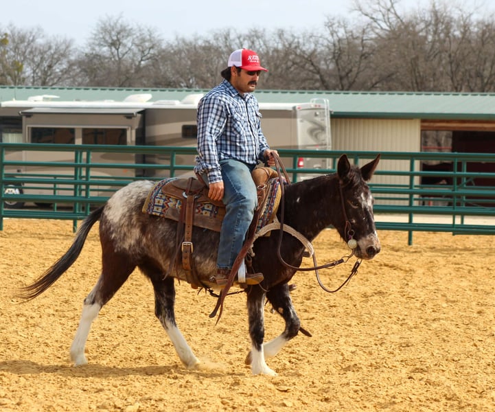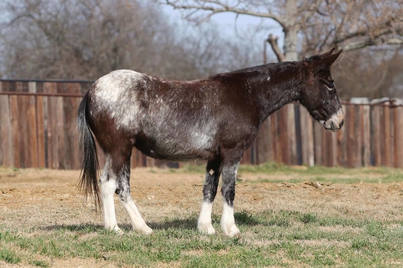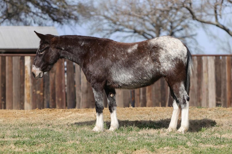 "AVAILABLE ON ONLINE HORSE AUCTION AT www DOT PlatinumEquineAuction DOT com BIDDING OPEN NOW thru SUNDAY | MARCH 1ST! *Final price will be determined on auction site* CONSIGNOR CONTACT INFO: M $ Performance Horses & Ponies 661-817-9120 LOCATION: Stephenville, TX Cali is a 6-year-old Appaloosa molly mule standing 13.0 hands tall and she is the total package wrapped in chrome. This little mule has been ranch seasoned and works weekly at the sale barn penning back cattle and loading trucks — she knows a full day’s work and shows up ready every single time. Gritty, honest, and all heart, she’ll stay with you from sunup to sundown without ever looking to quit. Out on the trails, Cali is bold and sure-footed. Steep hills, rough country, water crossings, bridges, and deadfall logs are just another day at the office. She rides soft and correct in the arena, walks, trots, and lopes nice circles, has a good stop, and backs up with ease. She’s been hauled to town, is traffic safe, and has even marched right down Exchange Avenue at the iconic Fort Worth Stockyards through heavy crowds, loud music, and nonstop commotion like a seasoned pro. She’s flag broke, will drag logs, track cattle, and has been started on the lead steer. Cali has even pulled a buggy and handled it with confidence. Easy to catch, stands tied, loads and unloads quietly, and you can saddle her up and step right on. If you’re looking for a tough, classy, do-it-all mule with eye appeal and real-world experience — Cali is it. We are open to anyone interested in her to schedule a time to come see her or if you can’t make it schedule a FaceTime showing to see her. If you need help with transport don’t hesitate to ask we have a list of reputable haulers that can get her safely to your doorstep WORLD WIDE including, Alaska , Mexico, Hawaii, Canada and anywhere in between. Located in Stephenville,Texas Contact Michelle at M$ Performance Horses & Ponies LLC 661-817-9120