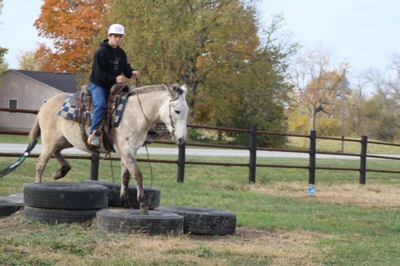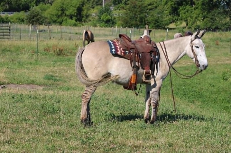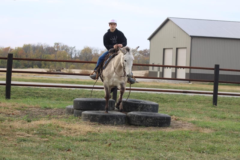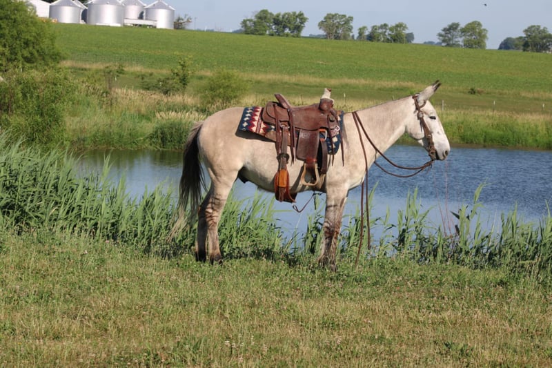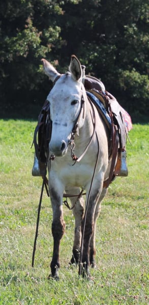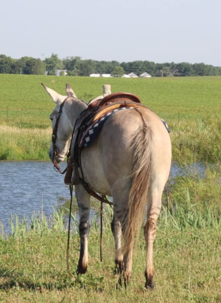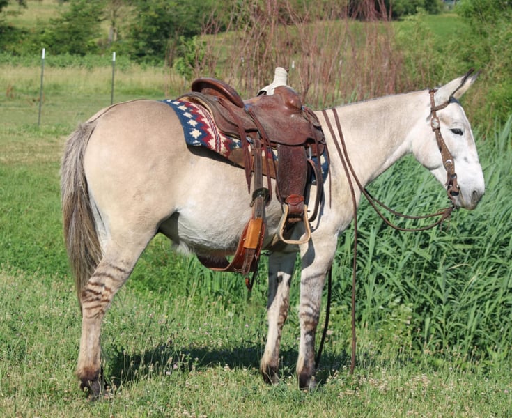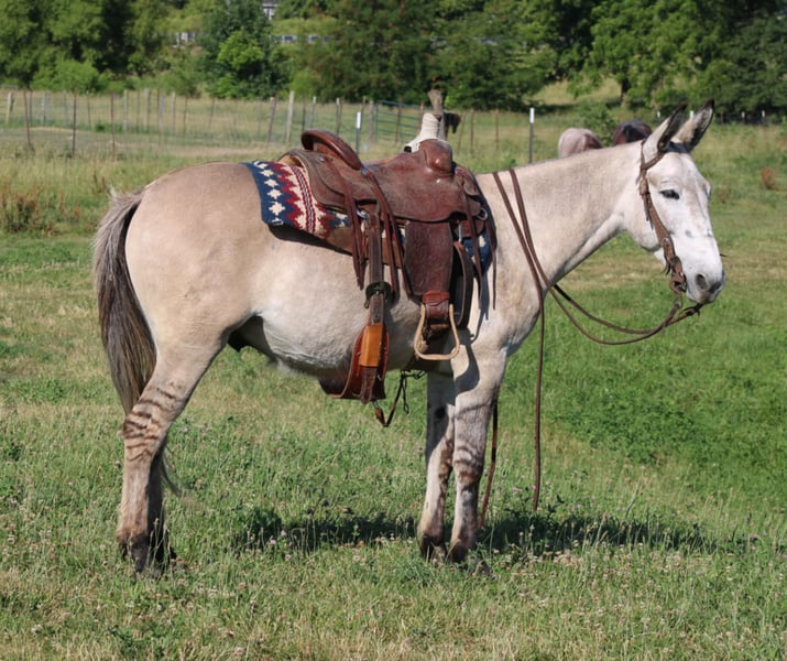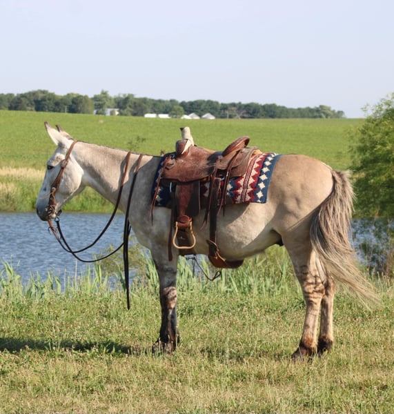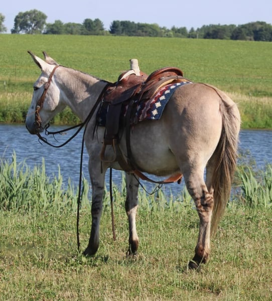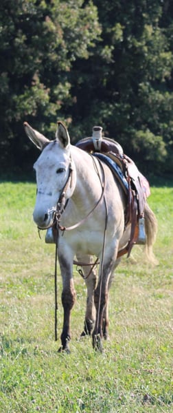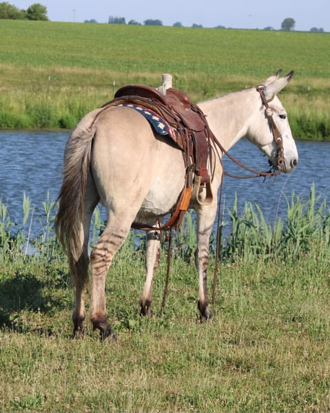 ONLINE AUCTION Place your bids at www.PlatinumEquineAuction.com Starting Bid $3500 Auction ends November 10th, 2024 Need a new saddle? Check out White Rock Saddles on our website or Facebook! Arthur is a fancy broke 8 yr old, 14.2h, zebra stripped grey dun john mule. Arthur has been ridden by my entire family, including kids aging from 4 to 14, he is kind and forgiving to newer, less experienced riders. He is willing to cross obstacles, water, logs, or anything else with a simple ask by his rider. He has been trail ridden all over the central united states including Caney Mountain, Arkansas, Emminance MO, and Shawnee National Forrest in Illinois. He handles the toughest of trails with a cool, confident demeanor. In Addition to trail riding, we have used him to rope and doctor calves, move pairs to different pastures, and ridden him to check fence lines. Arthur, neck reins one handed, side passes, lopes slow collected circles, slide stops, and back easily with collection. He has been desensitized with cards, flags, pool noodles, and umbrellas. He has great ground manners, walks with his handler and respects their space. He is great to handle his ears and feet as well. He trailers easily and will walk off the trailer or back off it. He rides in a regular QH bars saddle, has been ridden in a britchen , tail crouper, and pulling collar. He catches easily without feed. Arthur is a great mule, that will fit a first time mule family, or an experienced muleman/woman. It’s been an absolute please to own Arthur and Titus Equine is proud to offer him to the public. Watch his video and bid with confidence on this one of a kind colored, one of a kind attitude’d, quality john mule! Contact Titus Equine Mitch 217-549-3803 Located in Charleston, IL. ONLINE AUCTION Place your bids at www.PlatinumEquineAuction.com Starting Bid $3500 Auction ends November 10th, 2024 Need a new saddle? Check out White Rock Saddles on our website or Facebook!