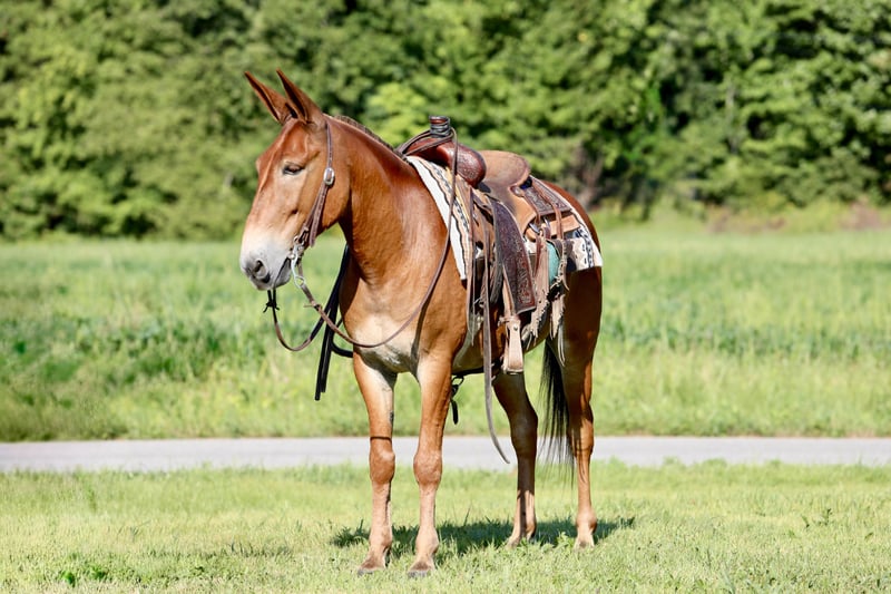 🍁𝒕𝒉𝒆 𝐅𝐀𝐋𝐋 𝑺𝒑𝒆𝒄𝒕𝒂𝒄𝒖𝒍𝒂𝒓🍁 Happening now thru MONDAY | SEPTEMBER 22nd - Available EXCLUSIVELY on HorseBid's website! For more details and to register visit: www.Horsebid.com CONSIGNOR CONTACT: Lucky 13 Equine 765-698-4655 LOCATION: Mount Vernon, Kentucky BREED: Mule REGISTERED: No REGISTERED NAME: Peter Pan COLOR: Sorrel HEIGHT: 14.3 AGE: 9 GENDER: John Mule 🌟Peter Pan is a 9-year-old, 14.2-hand John mule with all the looks, temperament, and training to stand out anywhere. He’s an experienced and versatile mount who is just as enjoyable on the trail as he is in the arena or at work. Easy to catch and eager for attention, Peter Pan has a quiet, people-oriented nature and a million dollar personality. He stands patiently for brushing, clipping, farrier work, and even having his ears handled, and he is calm and trustworthy around children, dogs, and even little critters. Peter Pan is 100% sound in every way. Under saddle, Peter Pan walks, trots, and canters smoothly in both directions, stops and backs willingly, and side-passes to open and close gates with ease. He works equally well alone or in company without becoming barn-sour or attached to other animals. This mule has been extensively trail-ridden, including overnight camping trips from here to Montana, and he handles new environments and varied terrain like a seasoned pro. Peter Pan has also been shown at local fun shows in multiple classes and used at exotic animal sales to push, pen, and sort a wide variety of animals from Brahamas to ostrich’s. This guy has spent many nights coon hunting, he tracks easily with dogs, stands good for gunfire, packs out game, and you can even pony your dogs back to the truck. Peter Pan is the type you can leave off and when you’re ready he’ll ride off just like you rode him yesterday. He is also not the typical John mule that’s going to aggravate anything he is turned out with. Whether you’re looking for a sure-footed trail partner, a handy ranch mule, or a safe, versatile mount for the family, Peter Pan combines training, temperament, and experience in one stout, eye-catching package. You do not have to have mule experience to get along with Peter Pan! Our boy is truly is NOT your typical mule and will be a blessing to any family.