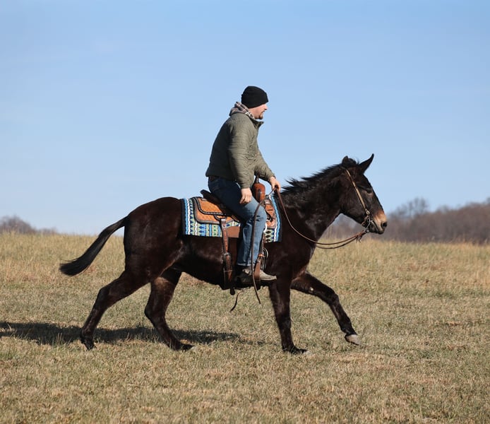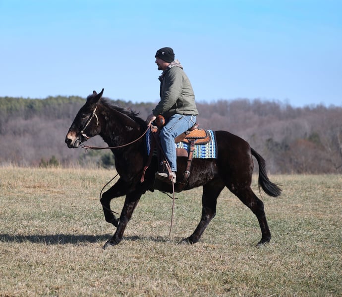 ONLINE AUCTION Place your bids at www.PlatinumEquineAuction.com Starting Bid $3500 Auction ends January 4th, 2025 Need a new saddle? Check out White Rock Saddles on our website or Facebook Jonah is a beautiful black John (gelding), he is a 10 yrs old and he stands a stocky built, 15 hands tall! This is one mule that is 100% no fuss-easy to ride! Whether you ride him every day or leave him off for a couple months, he rides gentle. My 7 year old nephew has ridden him around the farm and though the trails. Jonah is very laid back, rides on a loose rein and is never in a hurry. Jonah is not spooky and has miles and miles of experience from the mountains to the valleys he will cross anything that he is asked to from rivers to creeks, scale steep slopes while being sure footed and picks his path is a tight situation. He can handle the rough rocky trails, steep inclines and deep water… nothing bothers him and he feels right at home on the trails! He has been ridden around cattle. Jonah has been hauled on week long and weekend trail rides. He has been ridden by all members of our family. He loads right up with no issues. Jonah has a smooth lope although his favorite thing to do is walk on a loose rein and enjoy the scenery. He picks up his leads and rides in the arena as well as outside. Dogs do not bother him and is traffic safe! Jonah has no issues with his ears. Call Trevor Patrick 606-516-8069 with any questions. Located in Brodhead, KY. ONLINE AUCTION Place your bids at www.PlatinumEquineAuction.com Starting Bid $3500 Auction ends January 4th, 2025 Need a new saddle? Check out White Rock Saddles on our website or Facebook