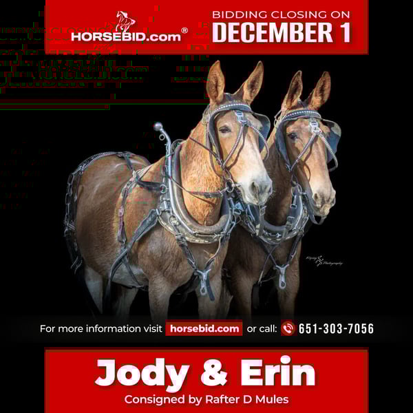 ⚜️ 𝓽𝓱𝓮 𝐇𝐨𝐫𝐬𝐞𝐦𝐚𝐧'𝐬 𝓢𝓱𝓸𝔀𝓬𝓪𝓼𝓮⚜️ Happening now thru MONDAY | DECEMBER 1st - Available EXCLUSIVELY on HorseBid's website! For more details and to register visit: www.Horsebid.com CONSIGNOR CONTACT: Rafter D Mules 651-303-7056 LOCATION: Hastings MN BREED: Mule REGISTERED: No COLOR: Red and white paint HEIGHT: 15.3 AGE: 10 GENDER: John Mule This team of mules have been there and done that! I have used them for dragging the arena to Sunday wagon rides for the family. They have also been used on wagon trains and on the ranch to feed cattle. One person can harness and hook them. They step over the pole and stand while you hitch them up. They have plenty of pull if you need to work a field or drag logs. They also ride the very best. They will ride alone or with the group. They are easy going under saddle and have been used in a string to put dudes on. They ride like saddle mules not driving mules. They are great with there feet. I have also used them to pack stuff into the hills. They are a one of a kind Fancy team that will fit just about everyone. Look no farther if you want two mules that can do it all. They are parade ready to ride or drive. Come to the ranch and try them out. They have been my personal team for awhile and I have known them and seen them work the last 5yrs.