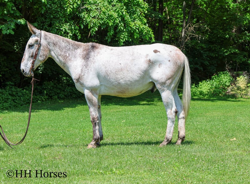 ONLINE AUCTION Place your bids at www.PlatinumEquineAuction.com Starting Bid $3500 Auction ends June 22nd, 2025 Need a new saddle? Check out White Rock Saddles on our website or Facebook! This is “NIGHTHAWK”, a unique colored, seasoned, well broke VARNISH ROAN APPALOOSA JOHN MULE that has been employed as a ranch mule and used for recreational trail riding. He has a true one hand neck rein, stops easily, and backs up. This mule is 15.3 hands tall, well built, and 12 years old. He has good bone and feet. He is sure footed in the mountains, lopes around nice in the arena, and is a solid trail mount. He will cross any depth of water without hesitation, he walks out nicely, and will lope off with no hump and no buck. He rides on a loose rein and is a nice mover that can cover ground smoothly. He has been used to push lots of cattle and ride in rough country. He is safe on the roads with traffic, he is not spooky, and he rides out alone with no issues. He stands to tack, mount, and groom. He picks up all four feet and handles his ears quietly. He is a really fun mule to ride that is comfortable, confident, and experienced. He will go anywhere you ask him willingly and he truly aims to please. Call H&R Horses Erin 304-238-4155 to make a Buy It Now Offer, to set up a time to come see him or if you have any questions. ONLINE AUCTION Place your bids at www.PlatinumEquineAuction.com Starting Bid $3500 Auction ends June 22nd, 2025 Need a new saddle? Check out White Rock Saddles on our website or Facebook!