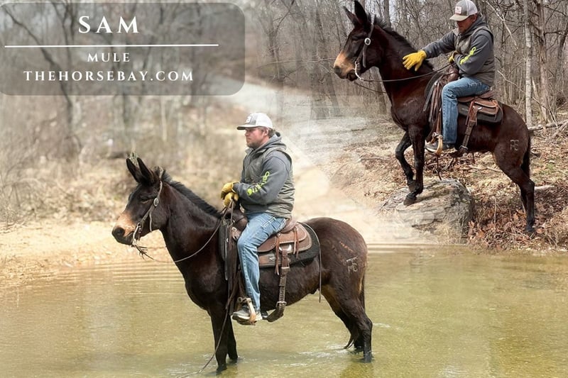 Sam is a 6-year-old John mule standing 14.1hh. Sam is as gentle and friendly as they come. He loves all the attention and has been trail ridden everywhere. He crosses anything you point him at. Sam rides out alone or in a group, whichever you prefer. He has a nice, easy trot and a smooth lope, one hand neck rein, and backs up well. Sam is perfect for the farrier loads and unloads great, same has never offered to buck or rear, and has no spook! If you’re looking for a nice, safe, gentle trail mule, Sam’s the man!