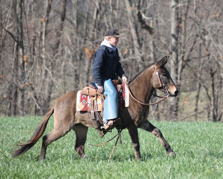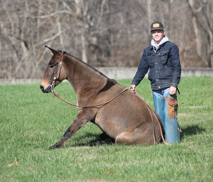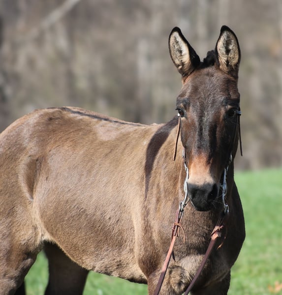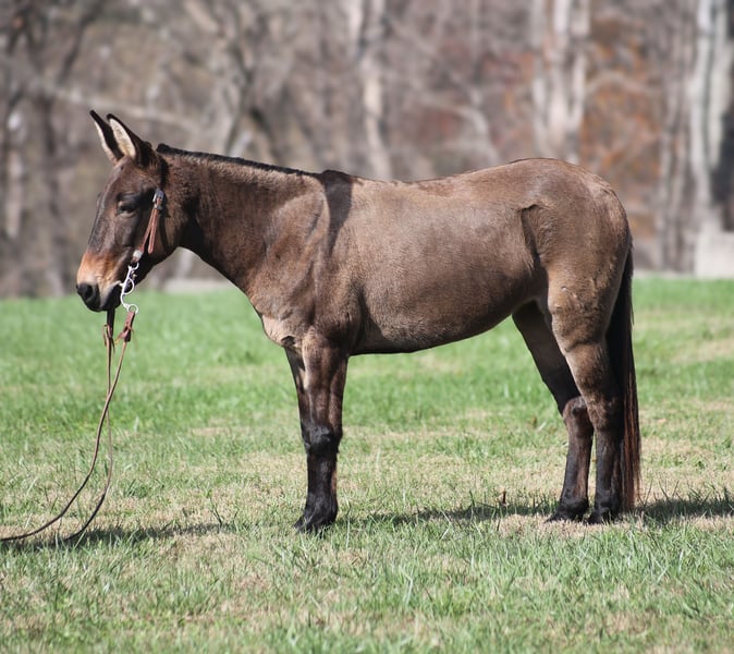 ONLINE AUCTION Place your bids at www.PlatinumEquineAuction.com Starting Bid $3500 Auction ends December 15th, 2024 Need a new saddle? Check out White Rock Saddles on our website or Facebook! Here is one that I’ll bet your neighbor won’t have one like! Meet Shirley Temple! She is a stout built, 13H, 7 year old, Grulla molly/mare mule. Shirley is 100% dependable! Whether she is ridden every day or left in the stall for a couple week or left out in the pasture for a couple months, she will be the same! She is easy to tack up, bridle, handle her feet, just cinch her up and lope her right off, their is no fuss with this gal. Shirley has been ridden by all ages even as young as 6 years old. She is the perfect family mule as she is safe and dependable yet versatile enough to do anything for any member of the family. I have ridden her at night coon hunting, where I have led my dogs, I had squirrel hunted off of her of the day time, used her to check my deer cameras, ride fences around the pasture, herd cattle, we have even roped a couple calves… no matter what the task at hand is, Shirley is going to help you get it done. She has been trail ridden extensively and geos anywhere that a big 16h horse can go (but you won’t bump your head on the tree branches like you will on those big guys), it doesn’t get too steep or too deep! Shirley will climb up the steep hills and slide down the other side if need be. She will scale up big slick rocks and jump off of them as well when asked. She will cross deep water with no issues and takes her time on the rocky terrain as well. The kids have played with her tracking the roping dummy and trotted/loped her around the barrels. Shirley does great in the herd and is also fine being stalled. She is always the first one to the gate to meet you if she is pastured and she loves attention whether that be getting brushed. Shirley lopes nice circles, takes her leads and reins around well. She tacks up and rides off quietly everytime! Shirley knows some tricks, she lays down with ease and enjoys being the center of attention for folks to gather around and pet on her, she also sets as well. Feel free to call Moore Trained Horses Logan 765-265-0033 with any questions or to make a buy it now offer. Located in Level Green, KY. We can set up shipping for a PRE-Christmas delivery to any state. ONLINE AUCTION Place your bids at www.PlatinumEquineAuction.com Starting Bid $3500 Auction ends December 15th, 2024 Need a new saddle? Check out White Rock Saddles on our website or Facebook!