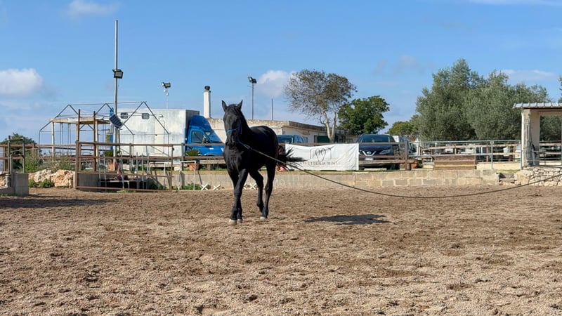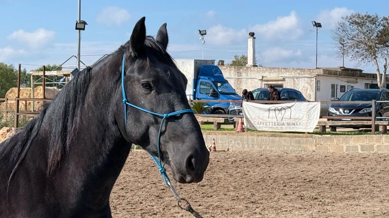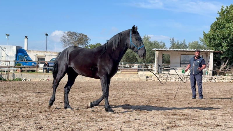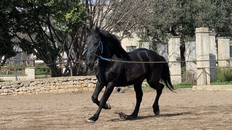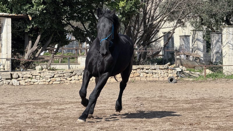 ~ Sinatra ~ ist eins dieser Pferde, dessen Entwicklung wir auch schon seit einigen Monaten beobachten und der uns immer wieder ins Auge sticht. Sinatra gehört zu den leichteren aber trotzdem optisch barockeren Typen der Murgesen. Sein Endmaß schätzen wir auf ca 158. Eine gute Basis besitzt der Jungspund, wie eine schöne Oberlinie und eine gute angenehme Halsung. Alles in allem ein typvoller Vertreter. Zusätzlich begleitet ihn ein sehr lieber Charakter, offen und freundlich, neugierig und nicht übergriffig erkundet er den Menschen. Der junge Hengst ist in dieser Zucht geboren und aufgewachsen, war rassetypisch draußen bis er 2 jährig in die Stallungen umzog und er an uns Menschen gewöhnt wurde. Sinatra kennt alle Basics, die man in seinem Alter kennen muss. Aktuell lernt Sinatra weitere Grundlagen, zu welchen auch der Sattel gehört. Sinatra ist dabei immer lernwillig und zeigt sich von der besten Seite. Du willst Sinatra persönlich kennenlernen? Derzeit steht er noch in seiner Heimat in Apulien – wir planen mit Dir gerne den Besuch dorthin. Röntgenbilder bringt er ebenfalls mit, auf Wunsch kann er direkt beim Züchter noch kastriert, sowie die klinische AKU organisiert werden. Ebenso planen wir alles weitere für Dich – Kastration (im Preis enthalten), Abwicklung des Kaufvertrages, Transport in Deinen Heimatstall usw. Wir freuen uns auf Deine Nachricht! Weitere Bilder und ein Bewegungsvideo auf Anfrage. - im Auftrag des italienischen Murgesenverbandes A.N.A.M.F.