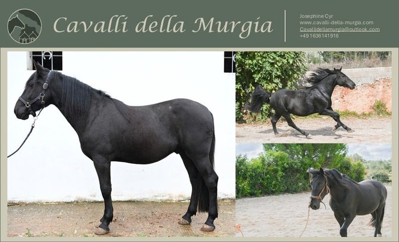 -Samir- Samir ist ein 2022 geborener Murgesenwallach mit einem Stockmaß von ca. 1,55 m. Aktuell befindet er sich in Martina Franca, Apulien – seiner Heimatregion, wo er bei einem verantwortungsvollen Züchter aufgewachsen ist und eine faire, artgerechte Haltung mit viel Auslauf genießen durfte. Im Umgang zeigt sich Samir höflich, feinfühlig und lernbereit. Er kennt bisher das Halfter, wurde bereits mit Reitergewicht im Schritt geführt und hat Erfahrung mit gymnastizierender Bodenarbeit am Kappzaum und an der Trense. Dabei zeigt er stets den Wunsch zu gefallen, hört gut zu und bleibt respektvoll – eine feine Persönlichkeit mit ruhigem Wesen. Samir eignet sich hervorragend als Freizeitpferd und für die Working Equitation. Wenn Sie bestimmte Vorstellungen bezüglich seines Ausbildungsstands haben, übernehmen wir gerne das weitere Training, bis der gewünschte Stand erreicht ist. Aktuell steht Samir in Gesellschaft mit Riccio, einem weiteren Murgesen. Samir kann derzeit für 13.000 € erworben werden, da er noch nicht angeritten ist. Mit Beginn seiner Ausbildung wird sich dieser Preis erhöhen – wer ihn jetzt entdeckt, sichert sich ein besonderes Pferd mit viel Entwicklungspotenzial. Besichtigungen in Apulien sind möglich – wir unterstützen Sie gerne bei der Planung Ihres Besuchs, der Abwicklung des Kaufvertrags, dem Transport nach Deutschland sowie einer AKU. Röntgenbilder liegen vor und können auf Wunsch eingesehen werden. Weitere Bilder und Videos senden wir Ihnen gerne zu. Wir freuen uns auf Ihre Nachricht! cavallidellamurgia@outlook.com www.cavalli-della-murgia.com Instagram: cavallidellamurgia