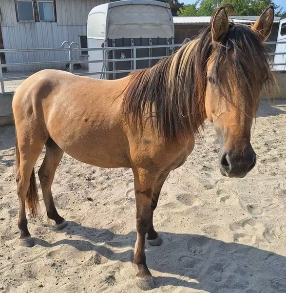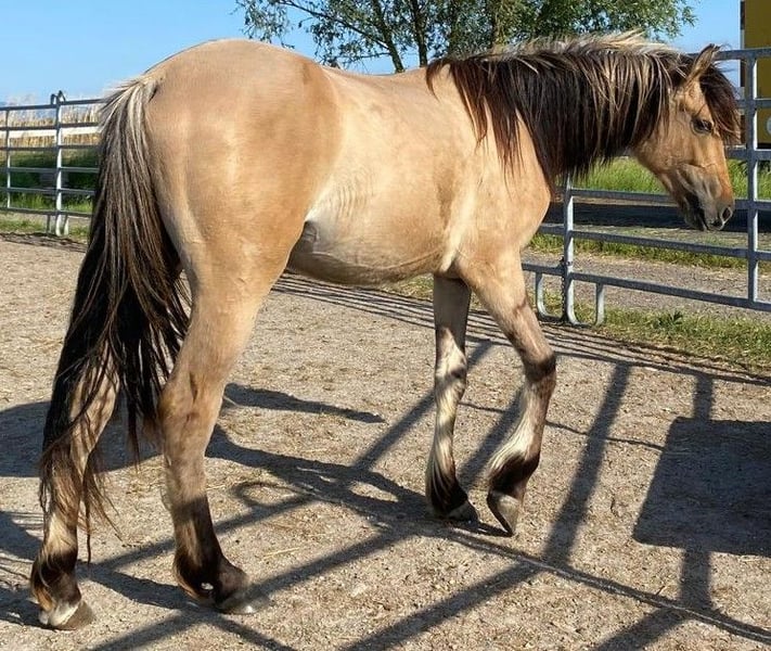 Zum Verkauf steht ein schicker Kiger Mustang Junghengst geboren im 10.06.2023, in der Farbe Dun mit 3 Farbiger Mähne. LJ-Aris ist ein kleiner Diamant, seine DNA ist für Züchter dieser Rasse interesant da diese in Europa nicht vorhanden ist. Sein Stkm. wird bei ca. 1,58 m liegen. Alles weitere gerne unter der 0173 9521224.
