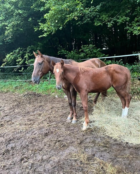 Her mother is a foundation-line Quarter mare of the old type (with papers), and her father is a Suffield Mustang with exceptional conformation (Artos-Ari) and truly beautiful gaits. This compact girl truly is something special. She will be suitable for all disciplines of equestrian sport, whether trail riding, Western, dressage, or leisure riding. She was raised in a natural herd environment on large, hilly pastures with several mares, foals, and her father. Born in March 2025, approximately 1.55 meters tall. Color: chestnut with two socks in front and two stockings behind. The markings are perfectly symmetrical. Currently, she is in winter quarters (open stable in a herd). She loads well and has already traveled twice in a trailer. If interested in purchasing, she can stay with us until then. Serious inquiries can request a video of her in action. Her trot is a dream. If interested, I am happy to send more pictures/videos. A viewing, including full siblings and parents, is always possible. She is now microchipped and vaccinated and was very well-behaved during the handling. Feel free to contact me via WhatsApp at 0179 5221143.