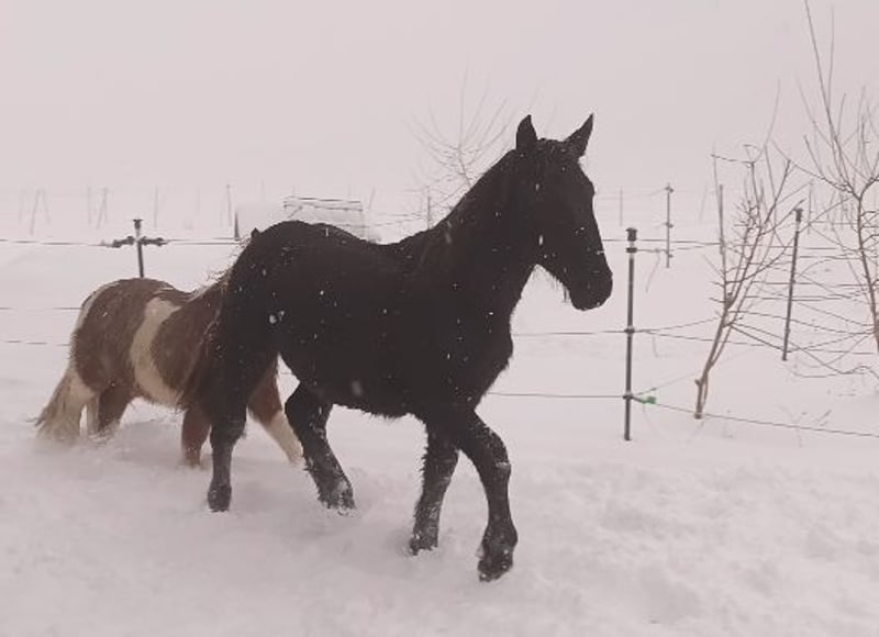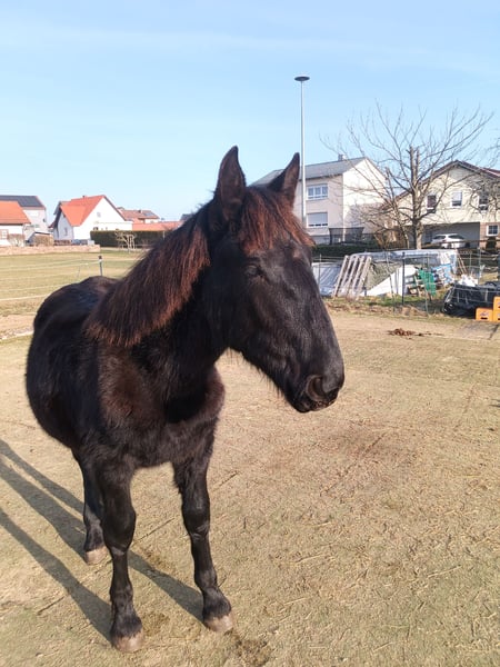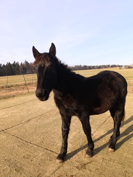 Rein schwarzer Noriker Hengst. Hat eine tolle Ausstrahlung, ist verschmust, lernt schnell und gerne. Kennt Hufe geben, Autos, Traktoren, Kinder, lässt sich problemlos führen und ein bisschen Bodenarbeit kennt er auch schon.